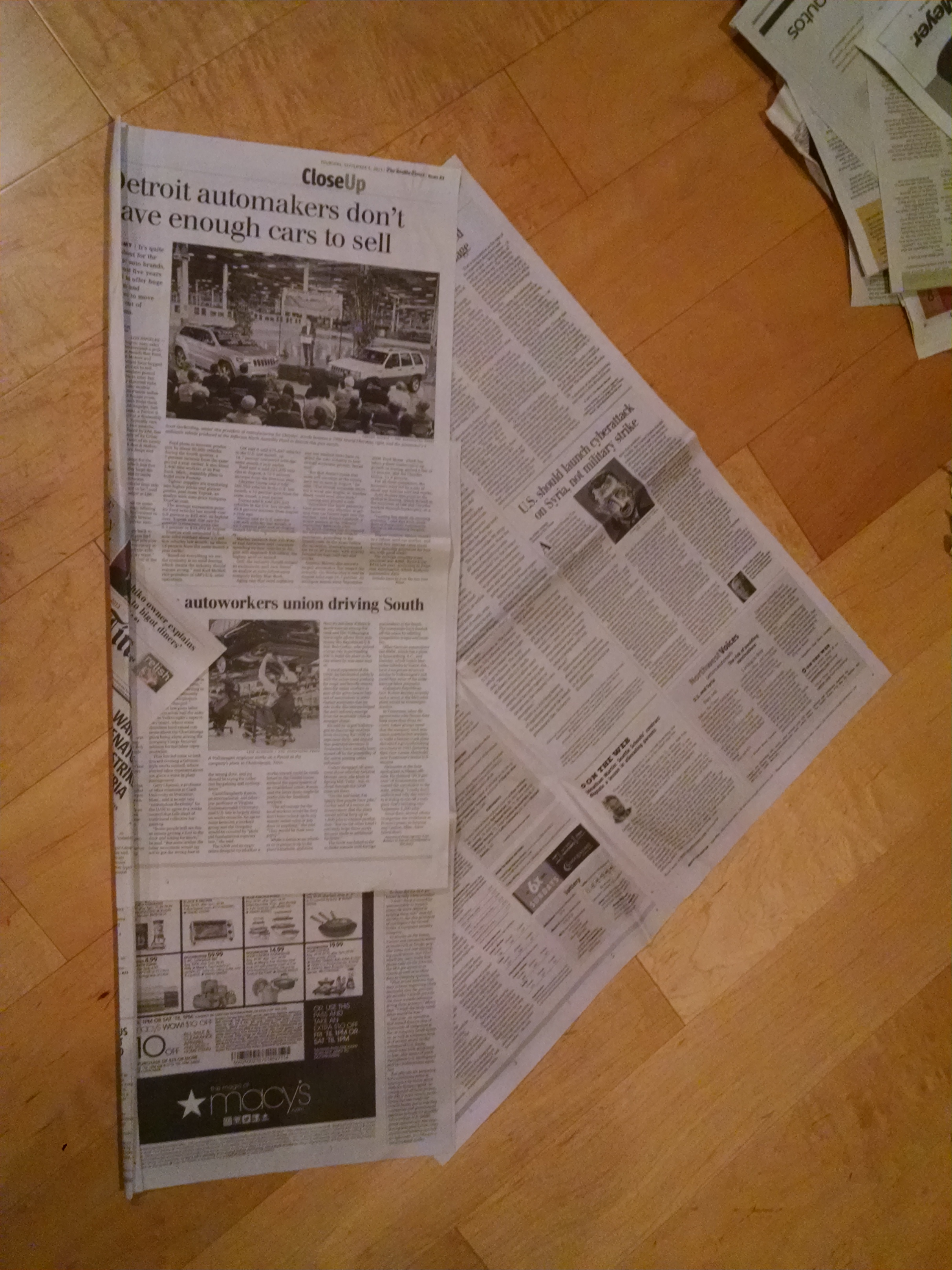 I’d found a blog post on Modern Parents, Messy Kids that showed how to build what they called “Life Size Building Blocks” – triangular trusses made from newspaper. To make the paper tubes, they recommend “Take two sheets of newspaper, lay them out flat and start rolling it from one corner.” The advantage of this method is it’s quick and easy, and you need just one little square of tape to fasten each one. Their 7 and 9 year old were able to roll these by themselves. When I made my rolls, I made 45 (enough for 15 triangles) in the time it took us to watch Kung Fu Panda. But – the ends of these are very thin – that means they’re easy to staple together, but they also are weak and floppy and can collapse in on themselves. So, my husband developed a new method. Take two pieces of paper, and off-set them a bit. Then lay those two diagonally across a third. Roll from there. This results in ends that are still thin enough to be stapled, but sturdier than the basic method.