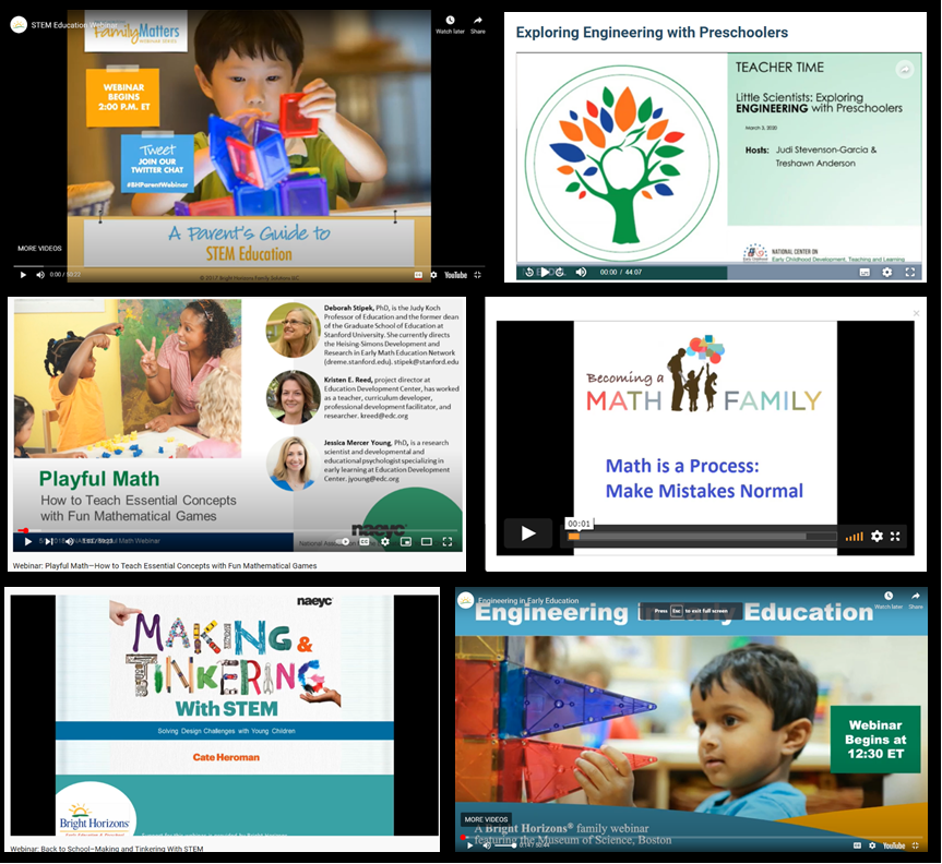 Becoming a Math Family. https://becomingamathfamily.uchicago.edu/. Not a webinar, but a series of short videos on both the theory of incorporating math into early learning (normalize mistakes, emphasize effort) and lots of ideas for hands-on math learning. From U Chicago.