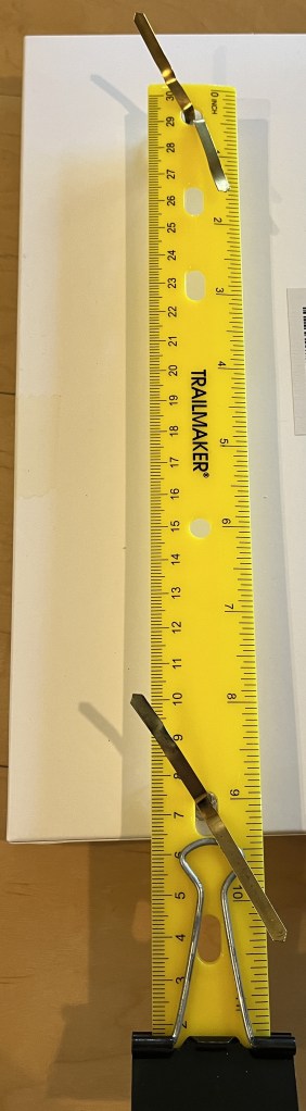 Supplies: a ruler that has holes at each end, 2 brads / paper fasteners (in the pictures, I use 2″ brads but smaller ones would be cheaper and look better), 2 sewing machine bobbins, 1 binder clip (1.5″ or 2″ gives more stability than a smaller one), string. [Those two links are Amazon affiliate links, but you may well have all the supplies you need for this at home.]