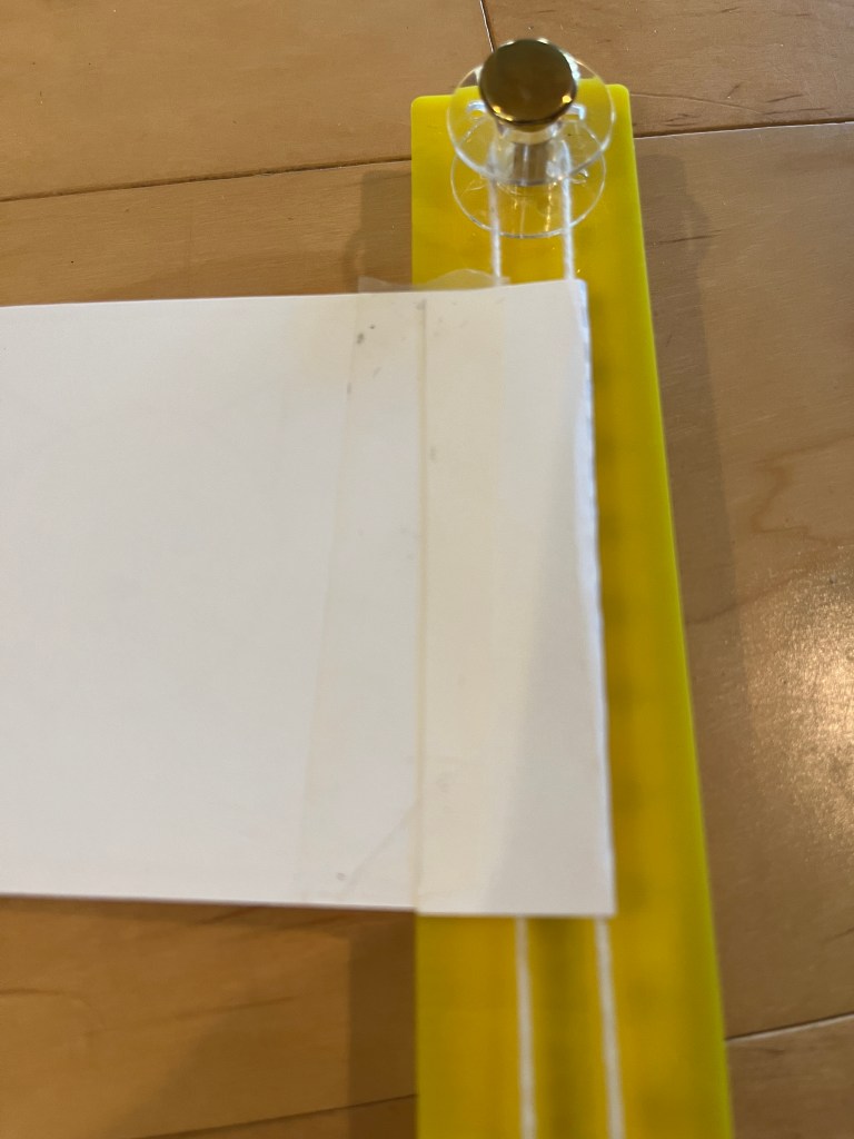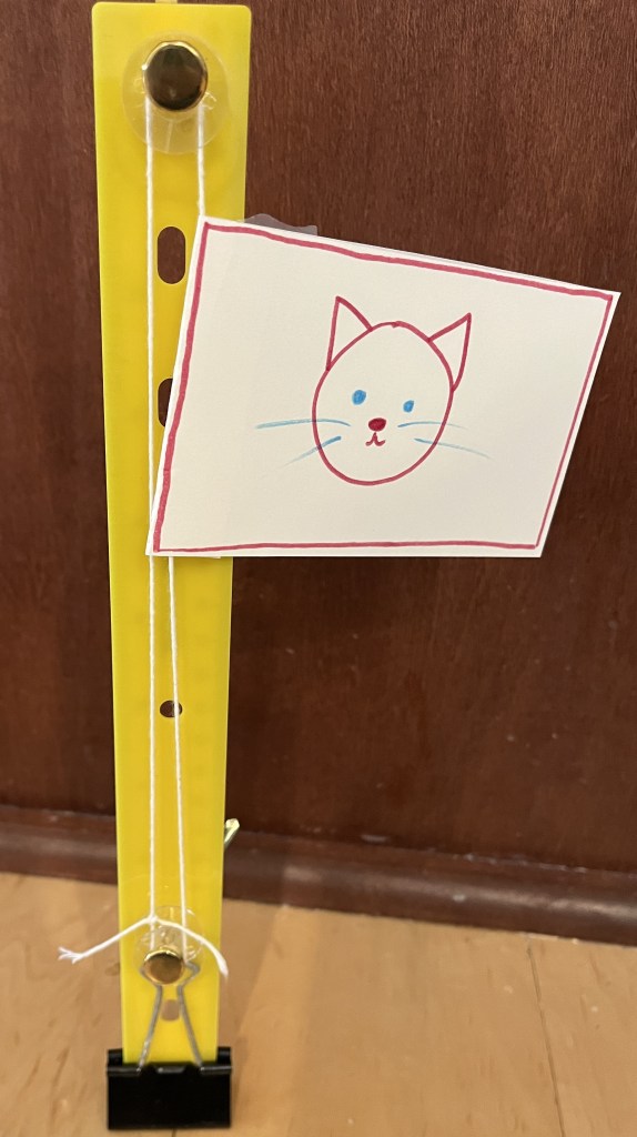 I had some inspirations for this project: Miss Miller’s Blog uses a paint stick with 2 holes in it, and then things that she calls push pins and clear spools, but I believe are what I would call brads and bobbins. KiwiCo has a tutorial for a flagpole that uses a dowel and binder clips. It doesn’t technically have pulleys, but does have pulley like action.