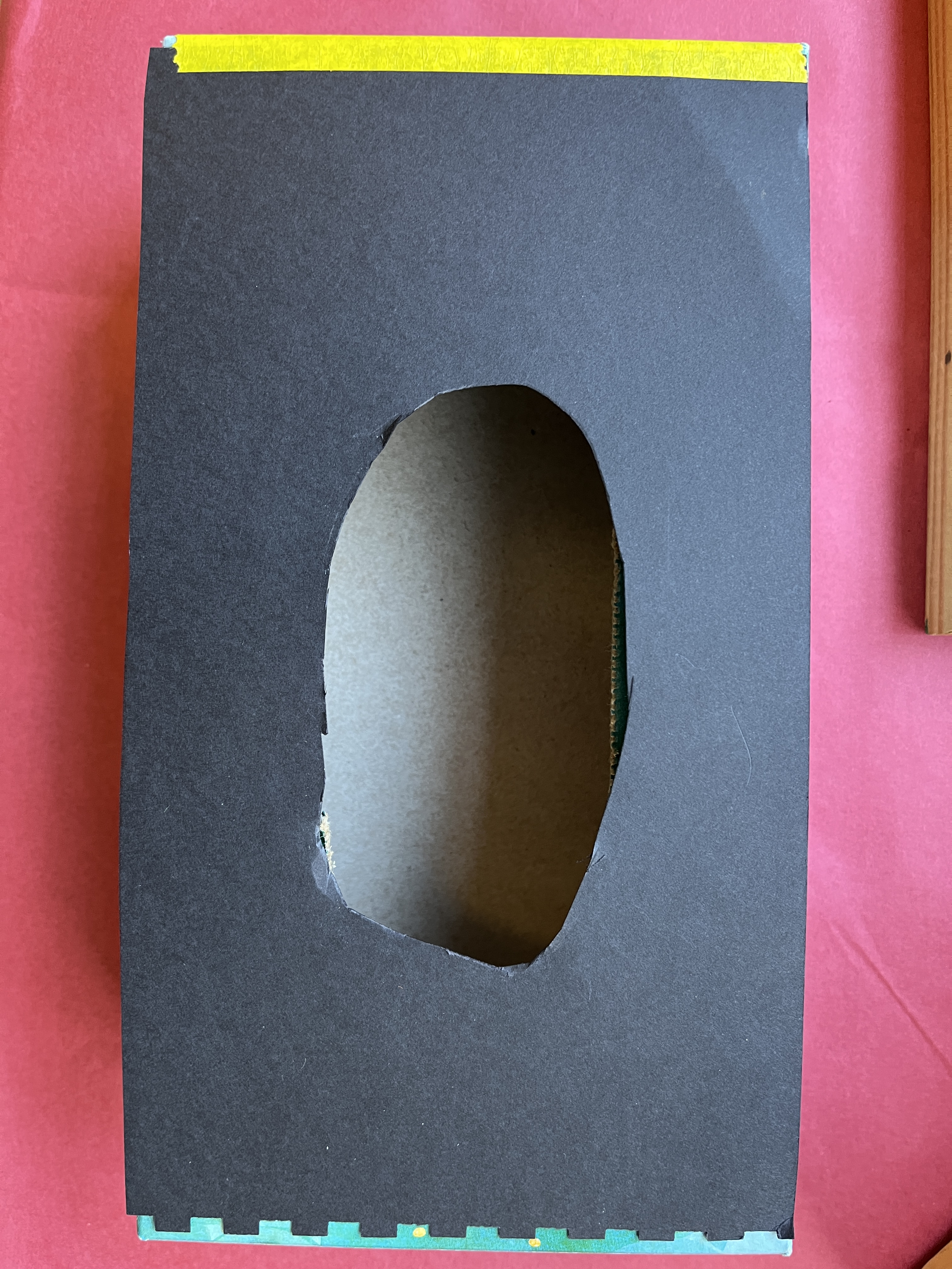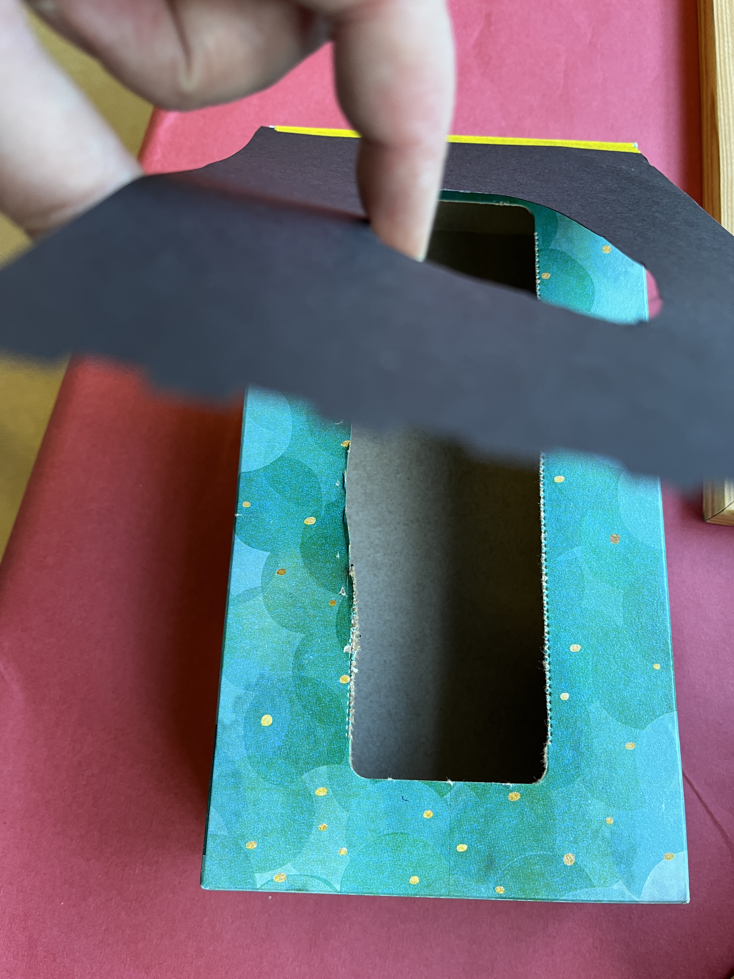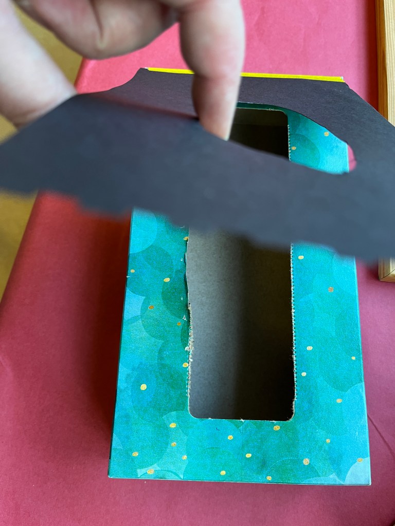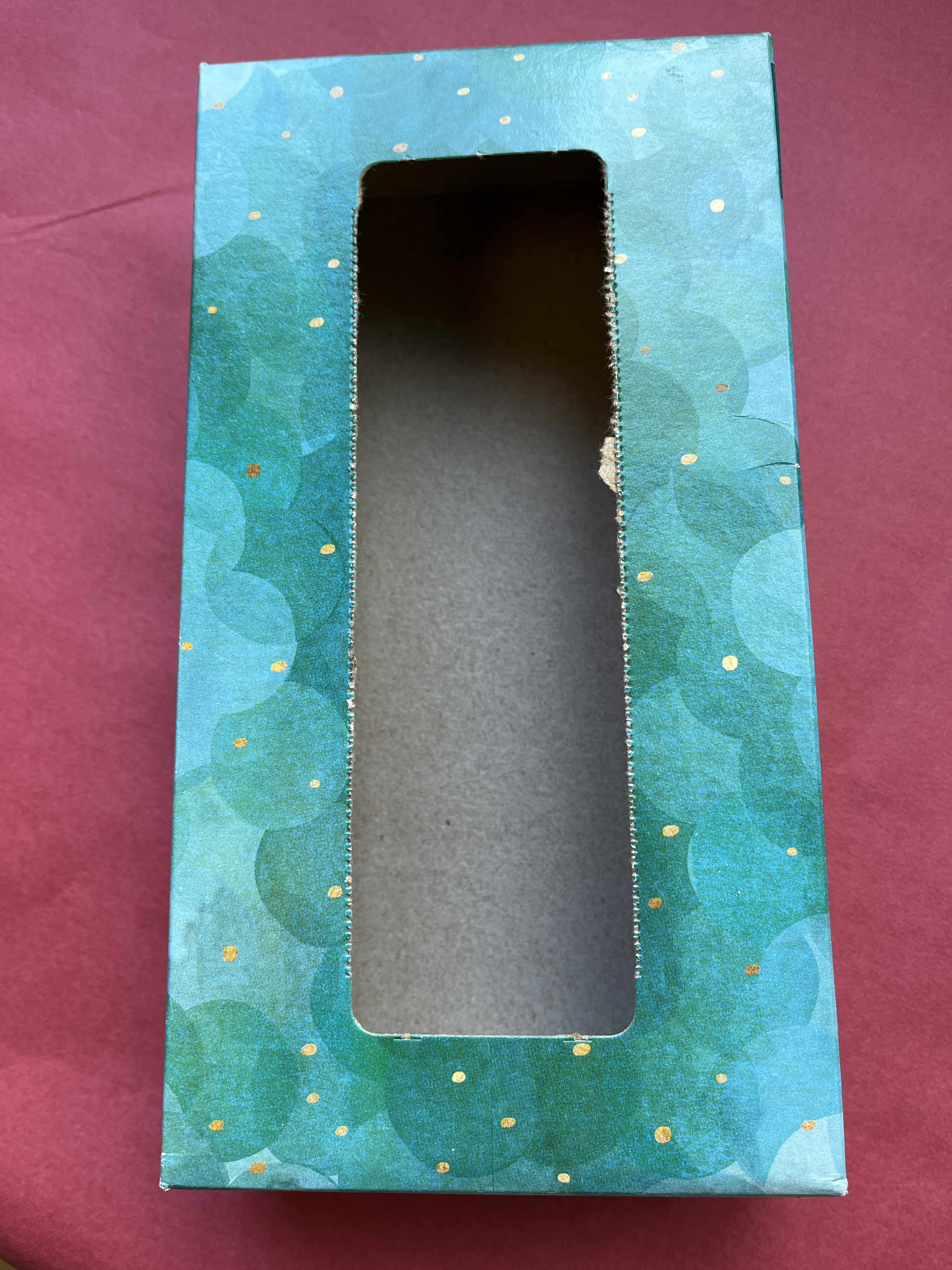 Or, you could cut a hole in the top of a cardboard box and put the box in the bin. You could add paper designs over that. (So, have an all-purpose hole box, and any time you want to change the design, draw a new picture on paper, cut the hole to match and add it.) Even something as simple as using a tissue box, and adding a cardstock cover to decorate would work – just tape it down on one side so they can lift it up to empty the box if desired.
