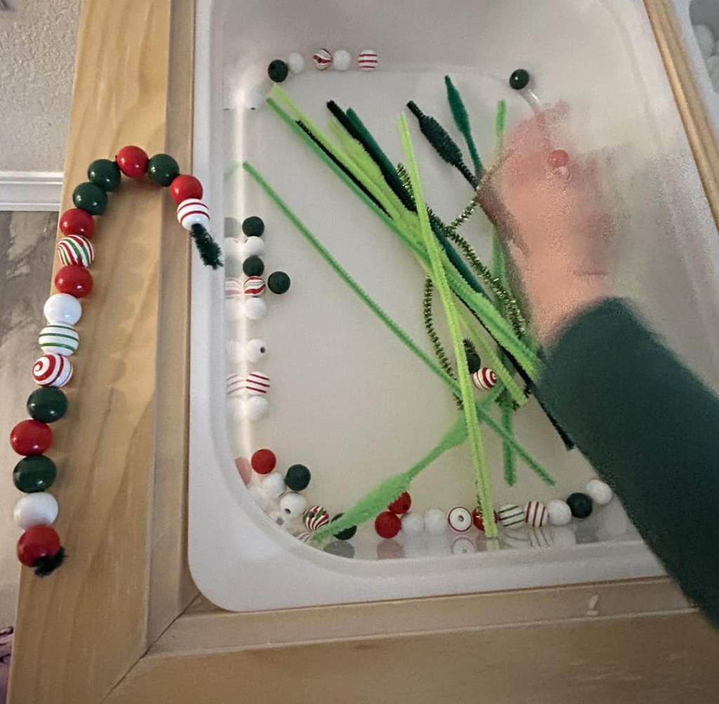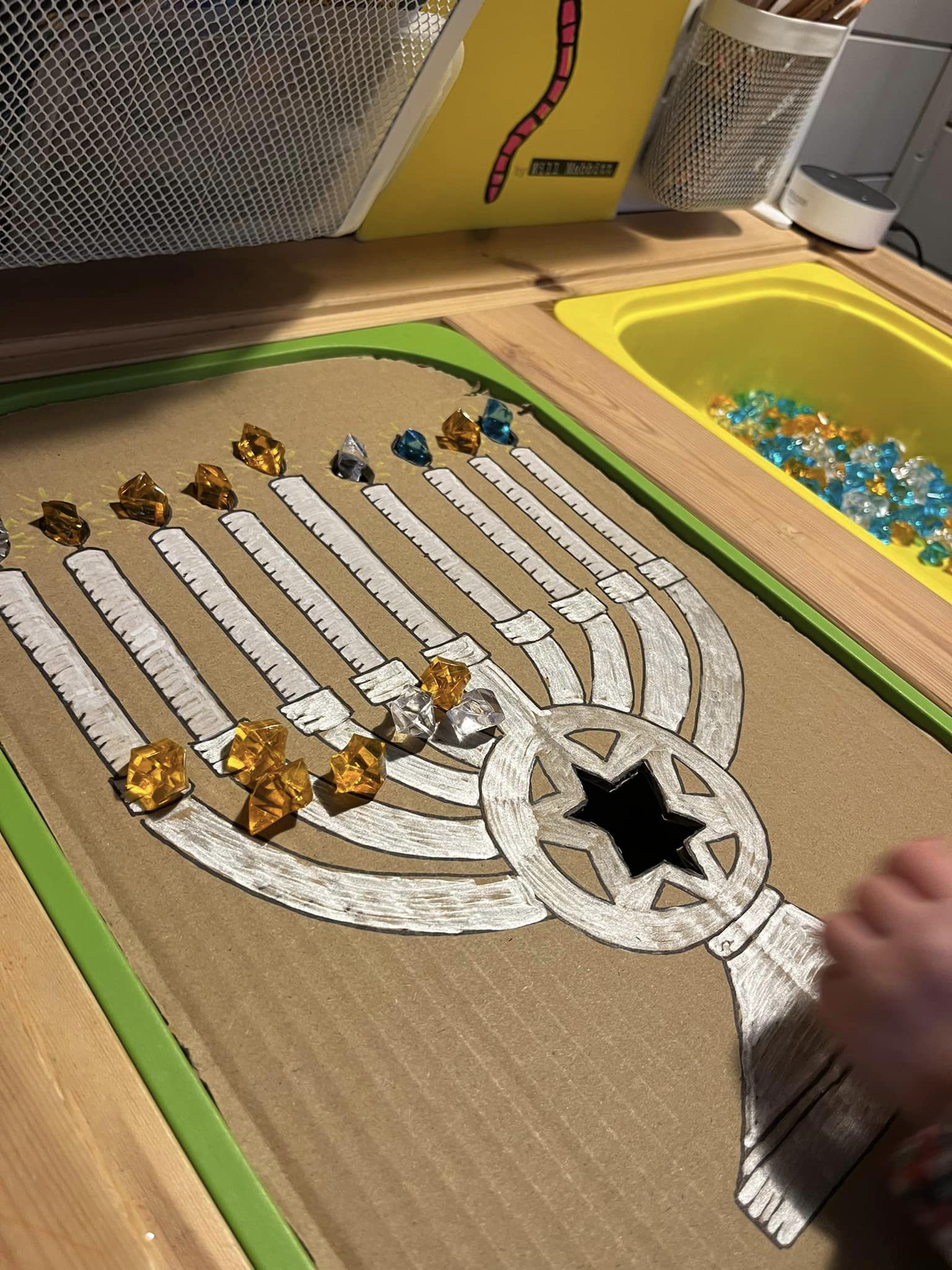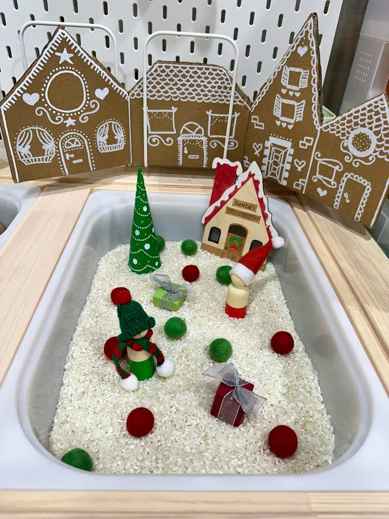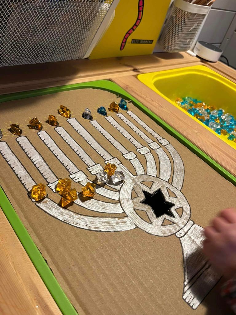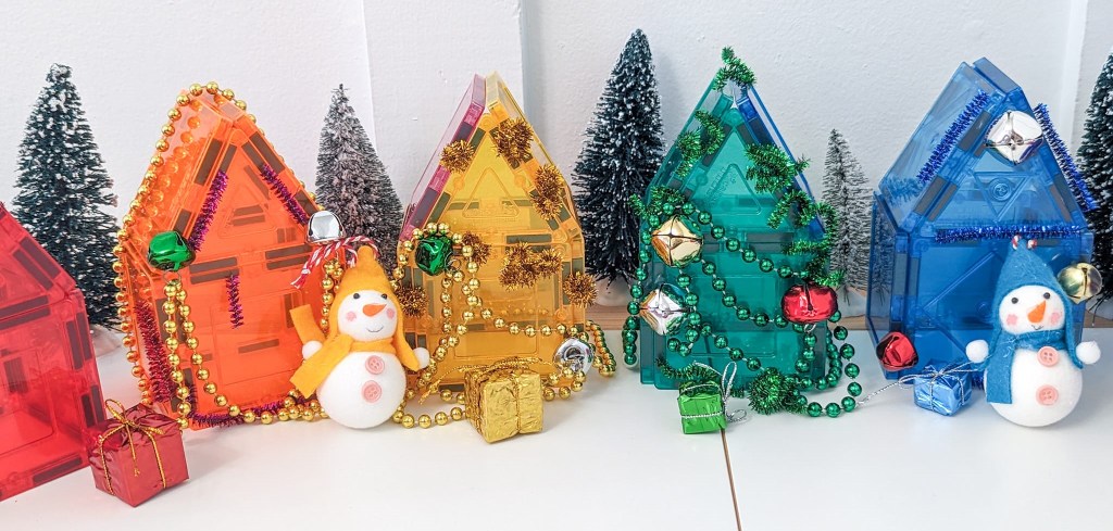 They can gather items from the sensory bin and use them to create an artwork. Here you see a playdough Christmas tree, a Hanukkah menorah to add “flames” to, and gingerbread houses from magna-tiles. (Triangle tiles make Christmas trees.)