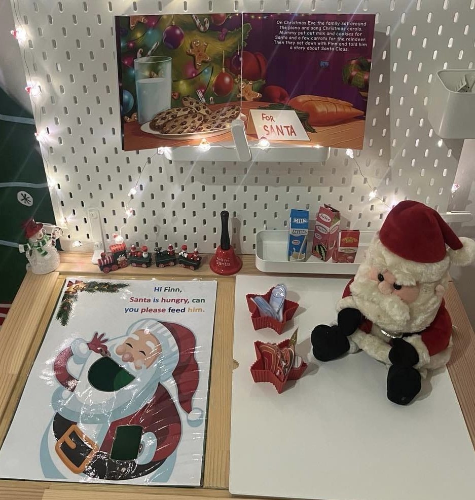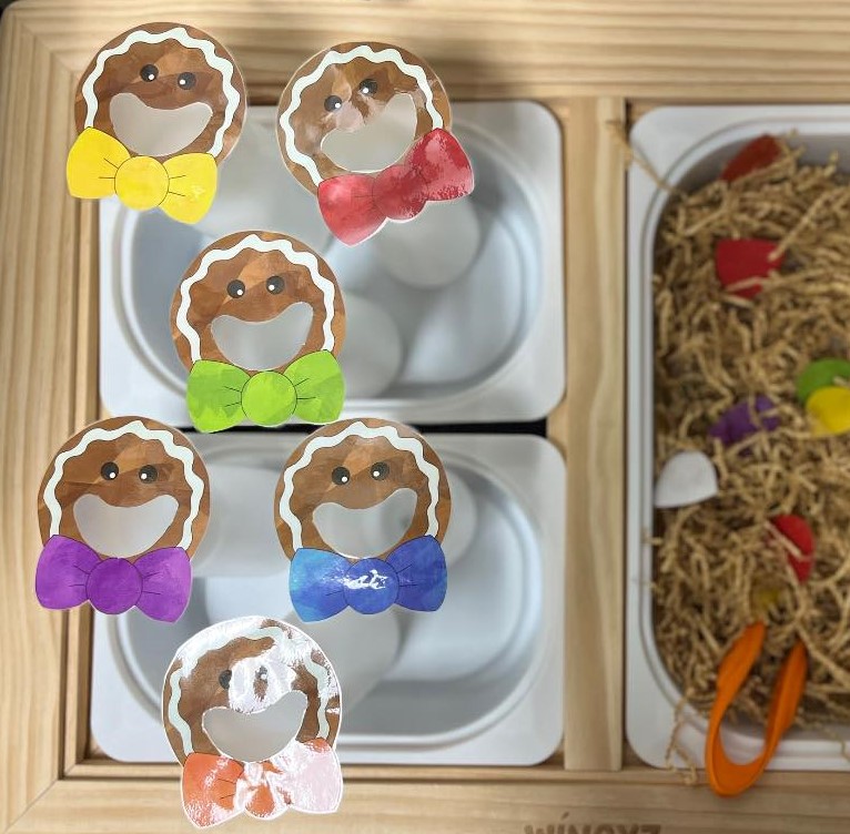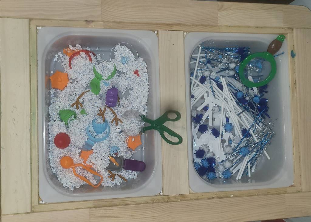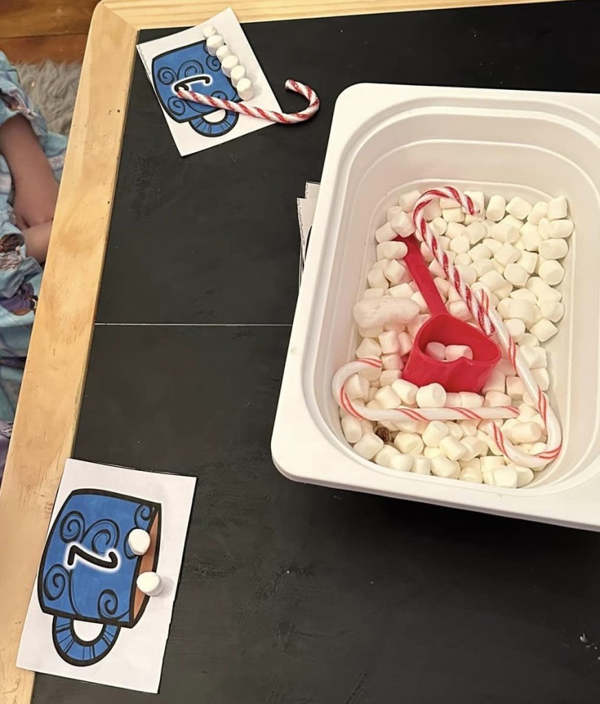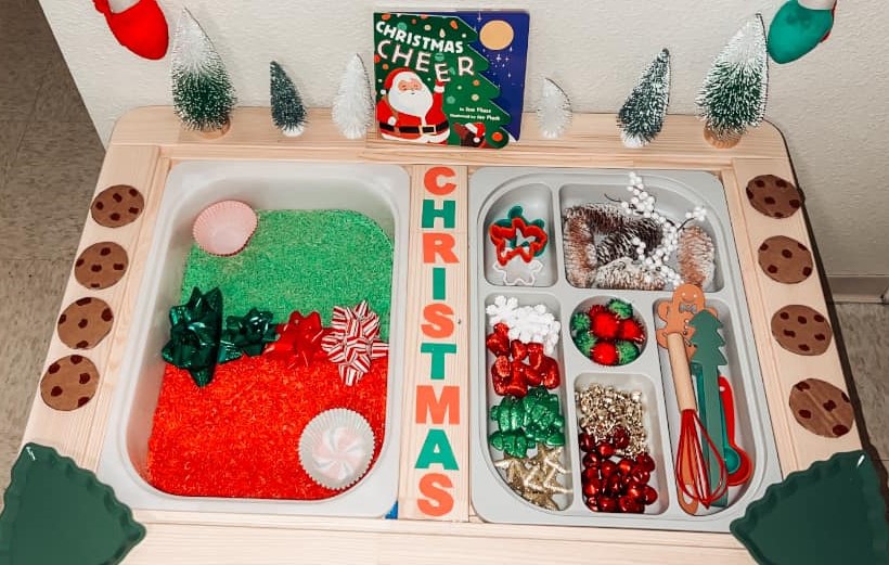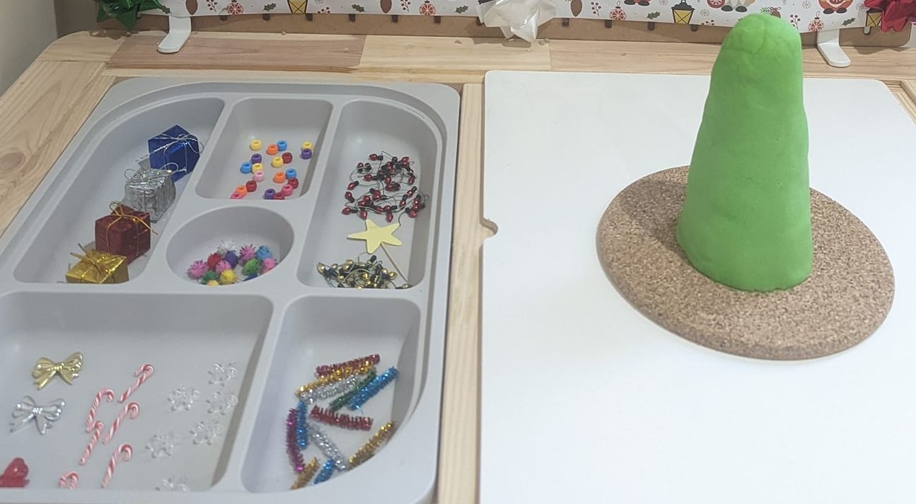 They can gather items from the sensory bin and use them to create an artwork. Here you see a playdough Christmas tree, a Hanukkah menorah to add “flames” to, and gingerbread houses from magna-tiles. (Triangle tiles make Christmas trees.)