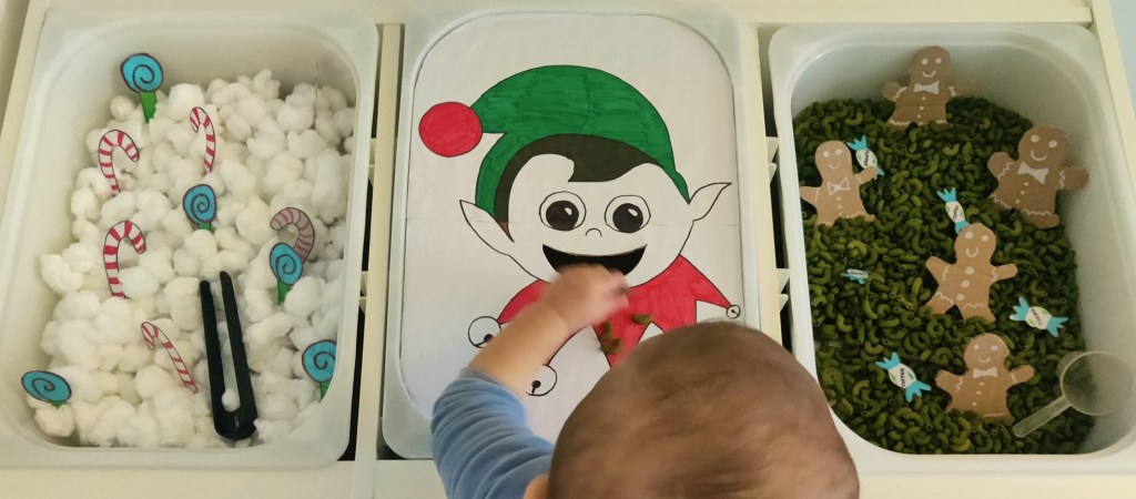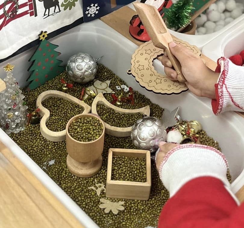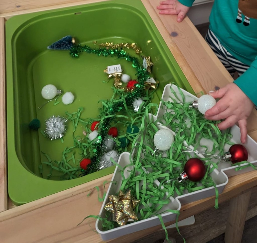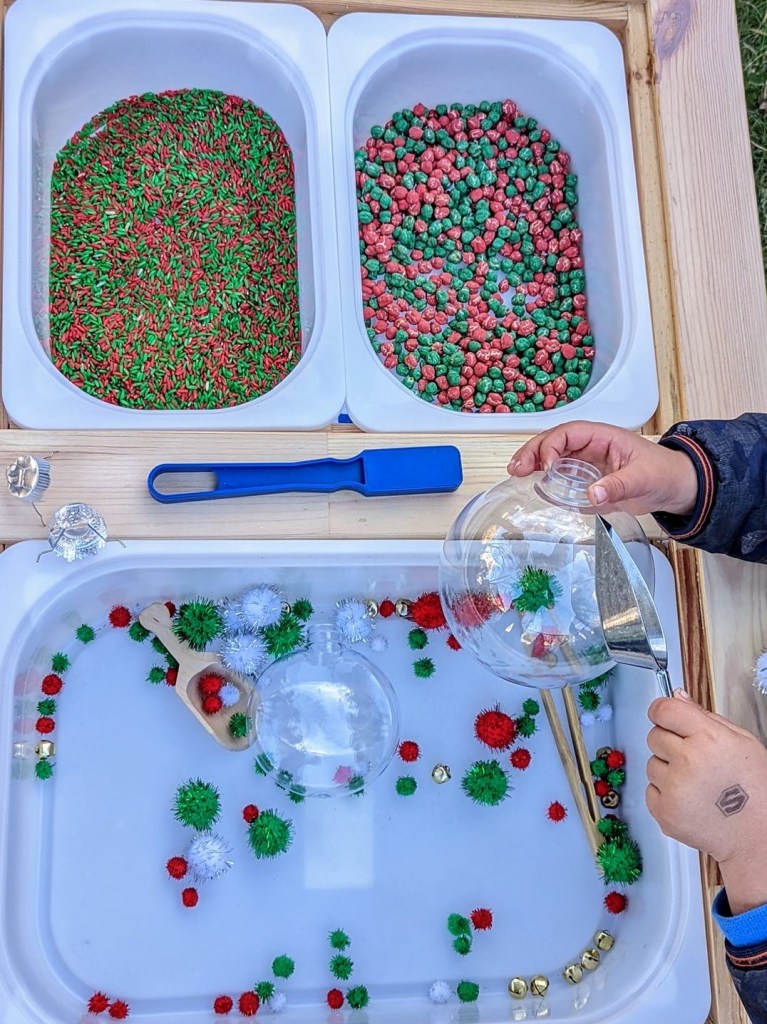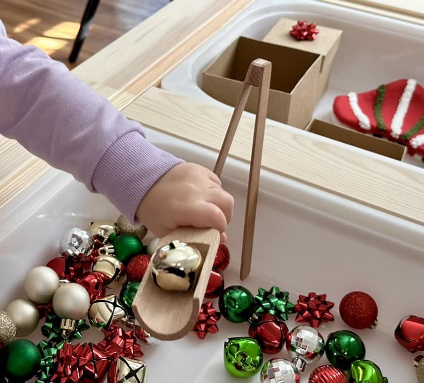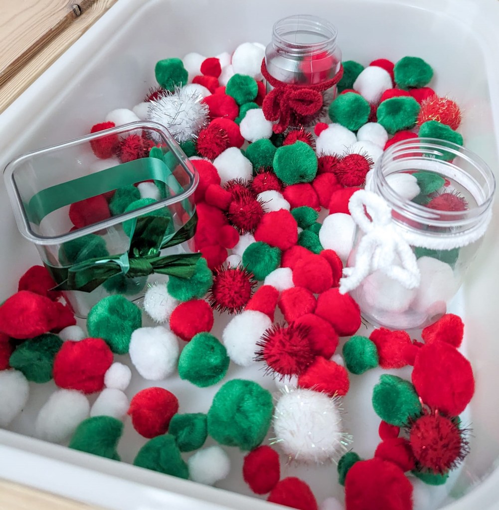 Instead of just picking up / scooping up material and pouring it back in the bin, it’s so much more satisfying to put it in a container. Here are some great examples of interesting containers: gift boxes, trays, interesting shaped bowls, muffin tins and clear ornaments. Or – feed the sheep or gingerbread men.