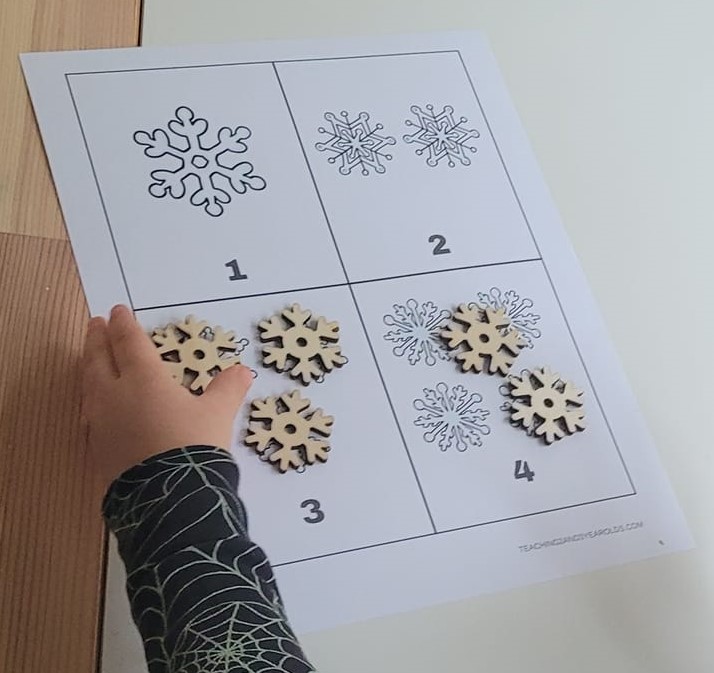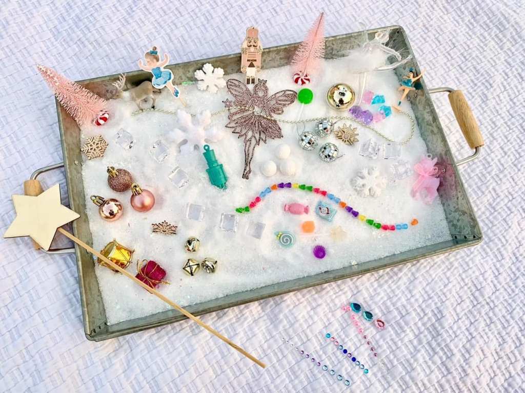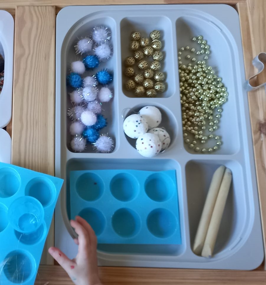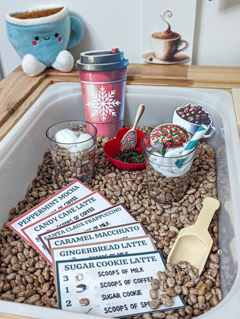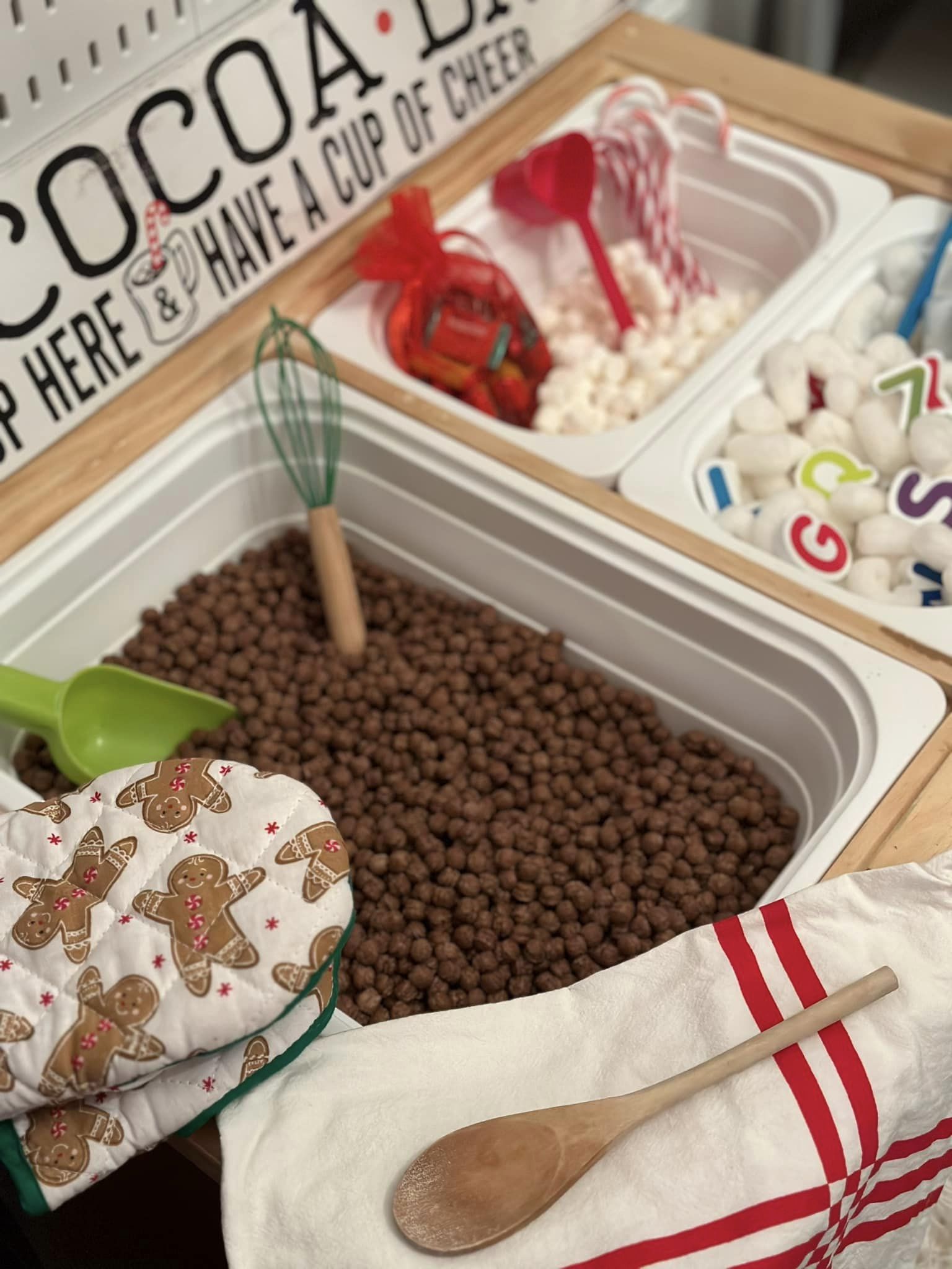 Instead of just picking up / scooping up material and pouring it back in the bin, it’s so much more satisfying to put it in a container. Here are some great examples of interesting containers: gift boxes, trays, interesting shaped bowls, muffin tins and clear ornaments. Or – feed the sheep or gingerbread men.