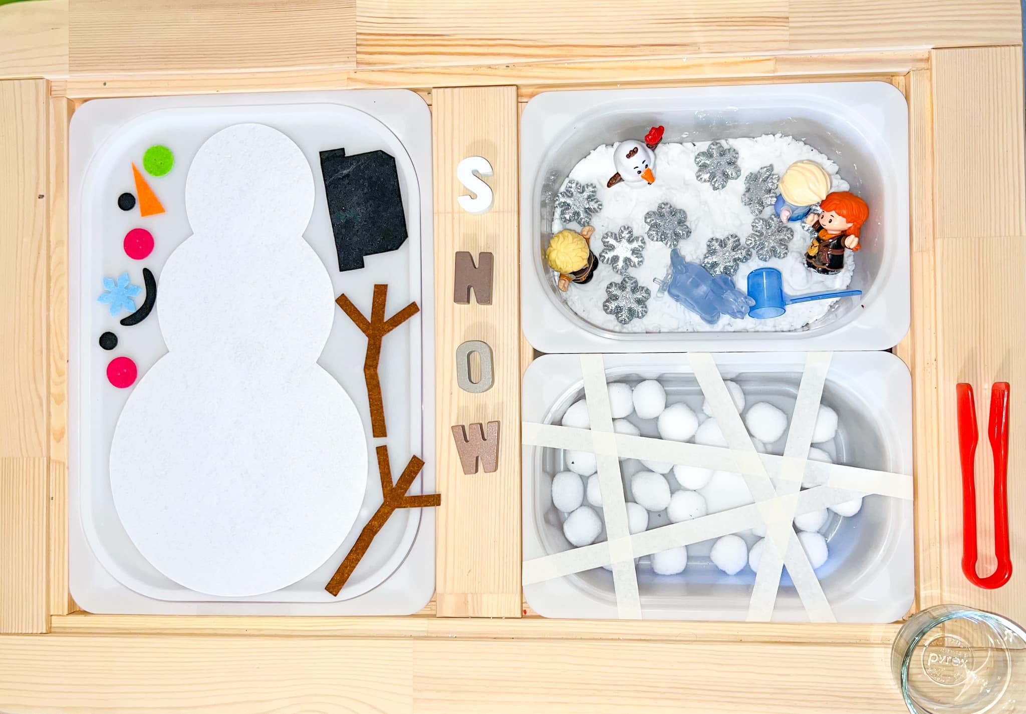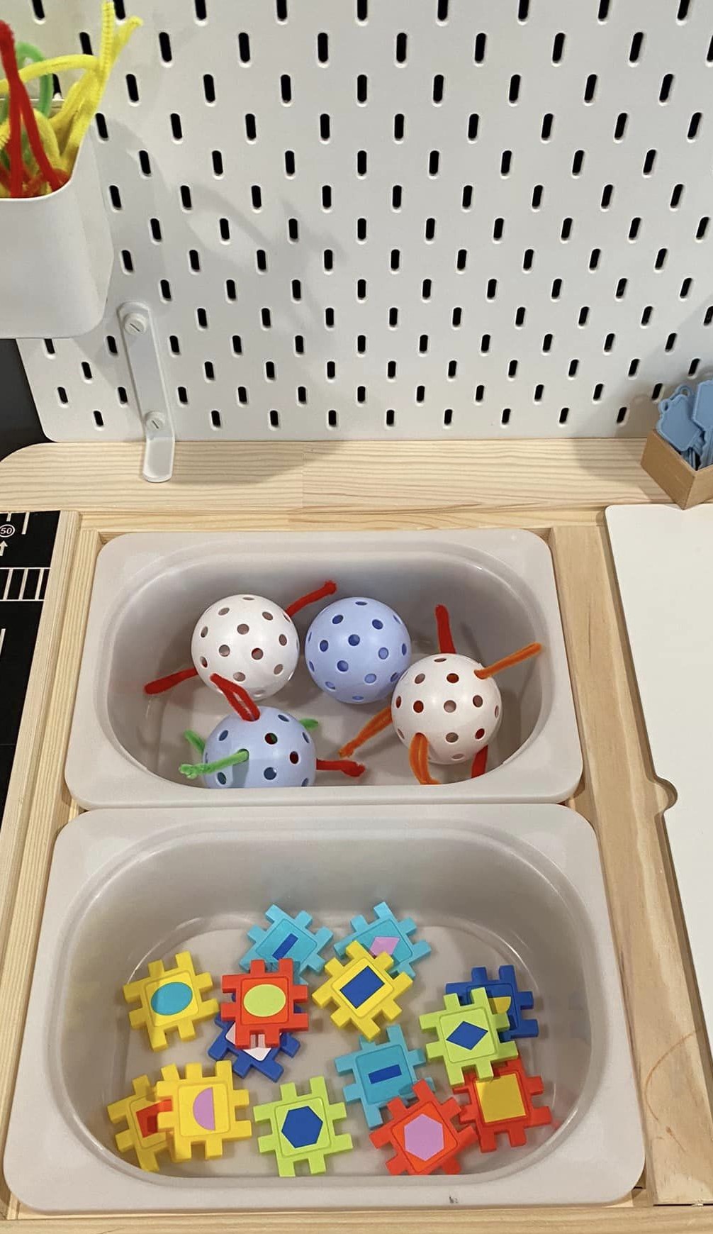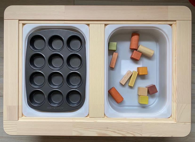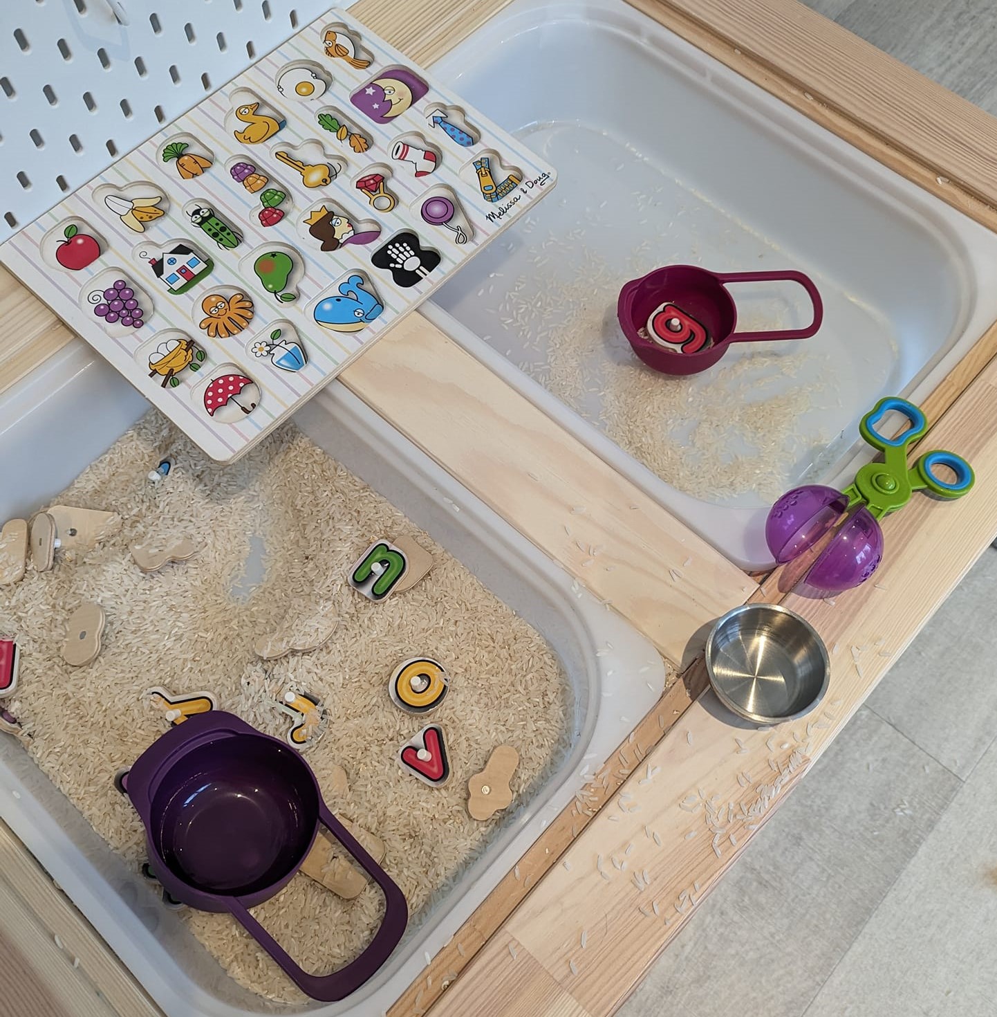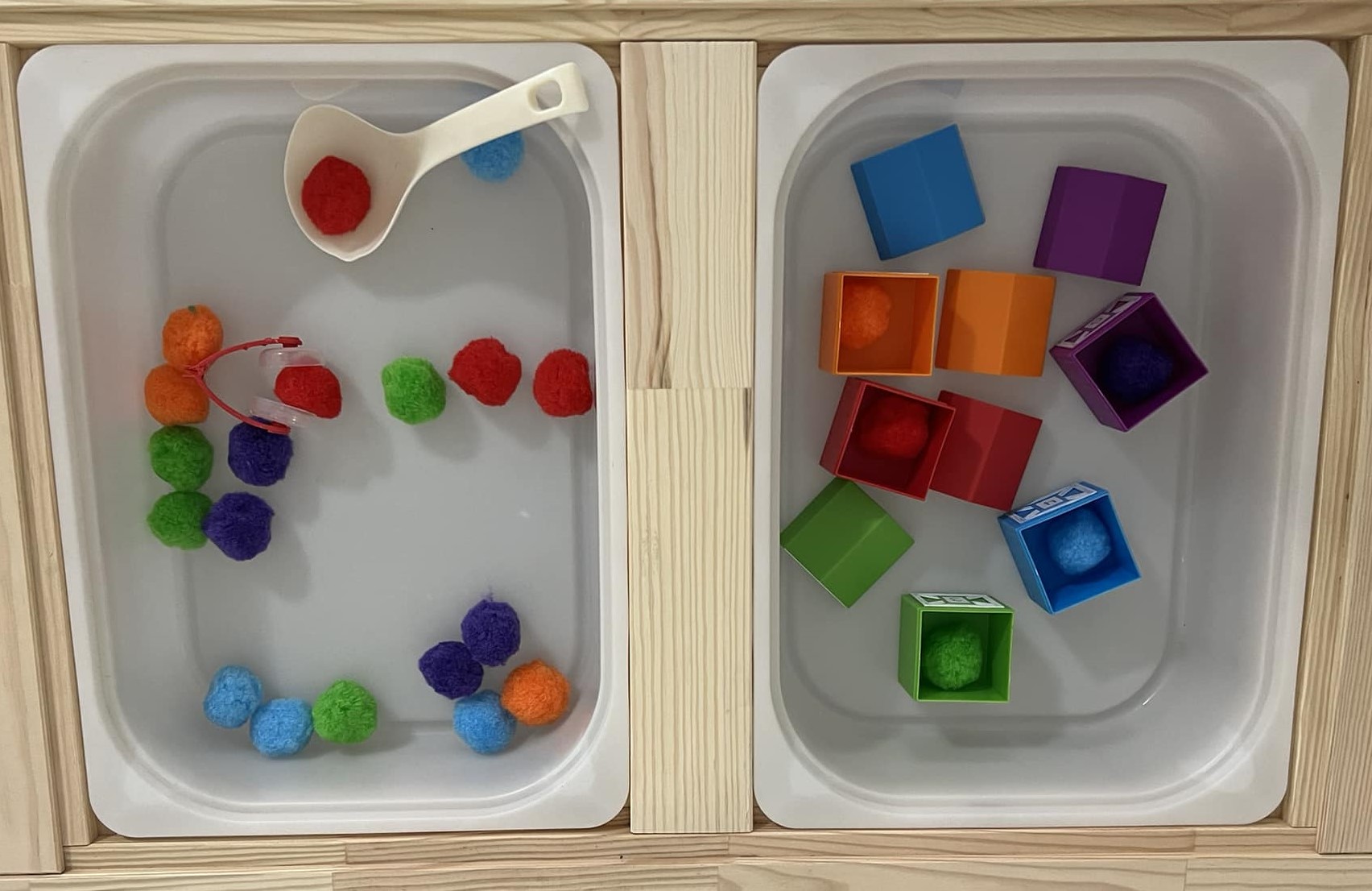 I recently joined a Facebook group called Flisat Table Simple Set-Ups. (The Flisat is a table from IKEA that can combine with Trofast storage bins or trays and some optional hacks to make a sensory bin. But it’s mostly sensory bin ideas that could work in any container.)