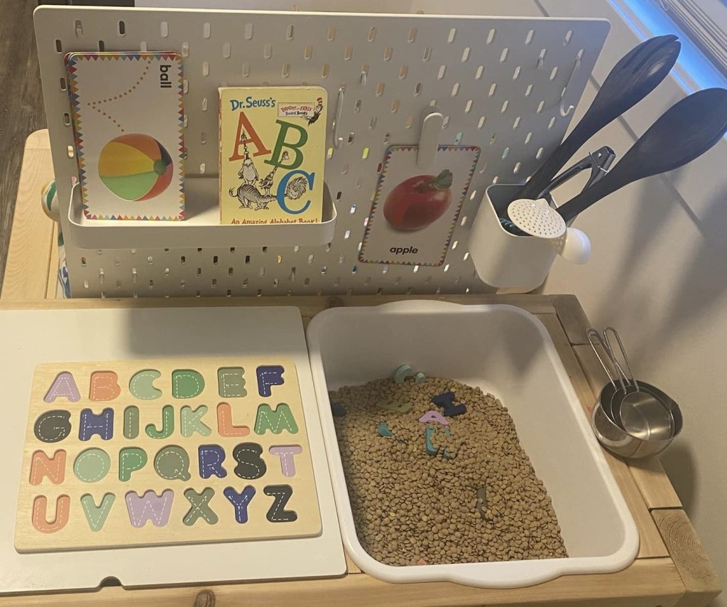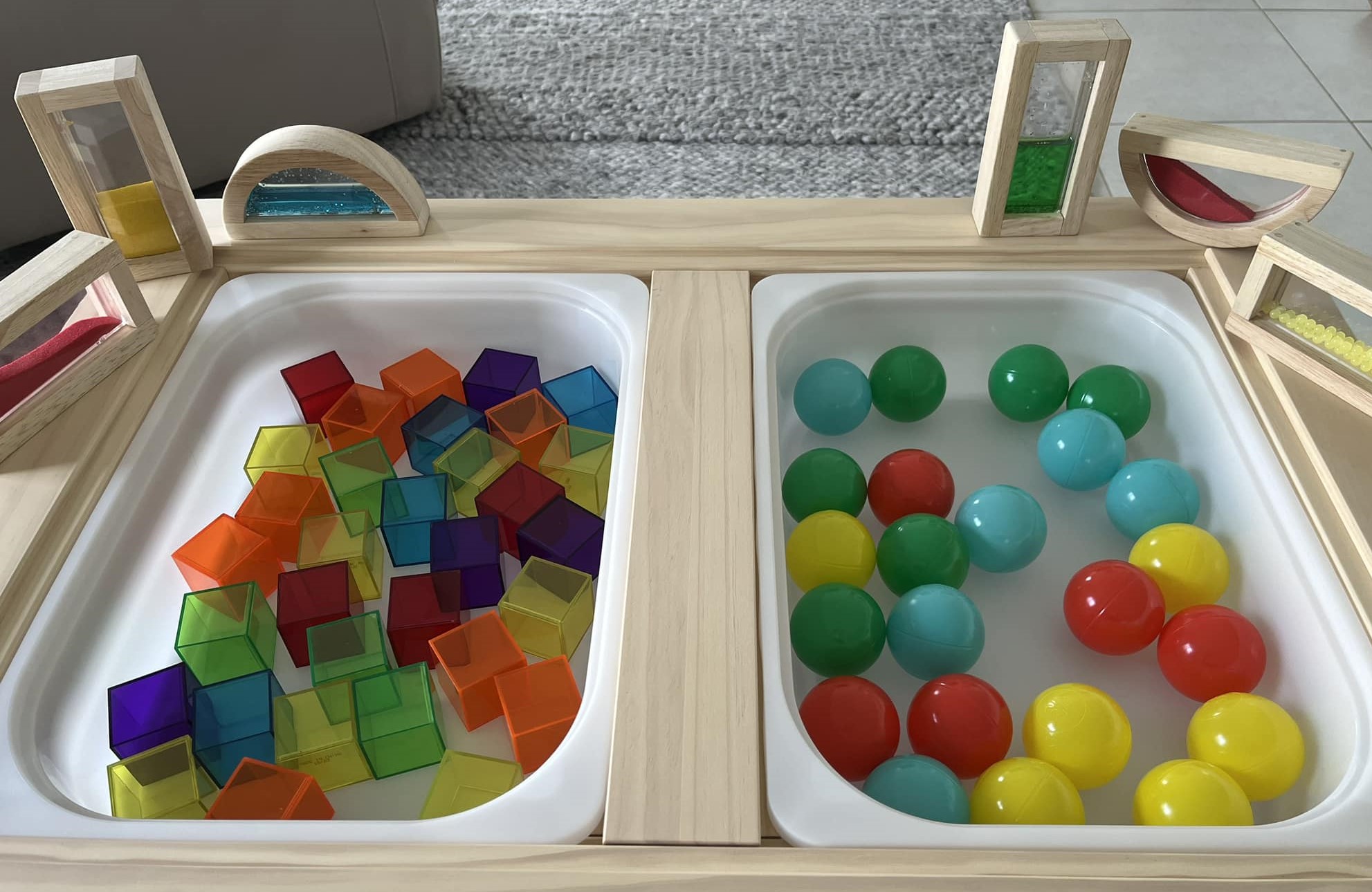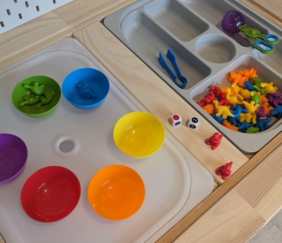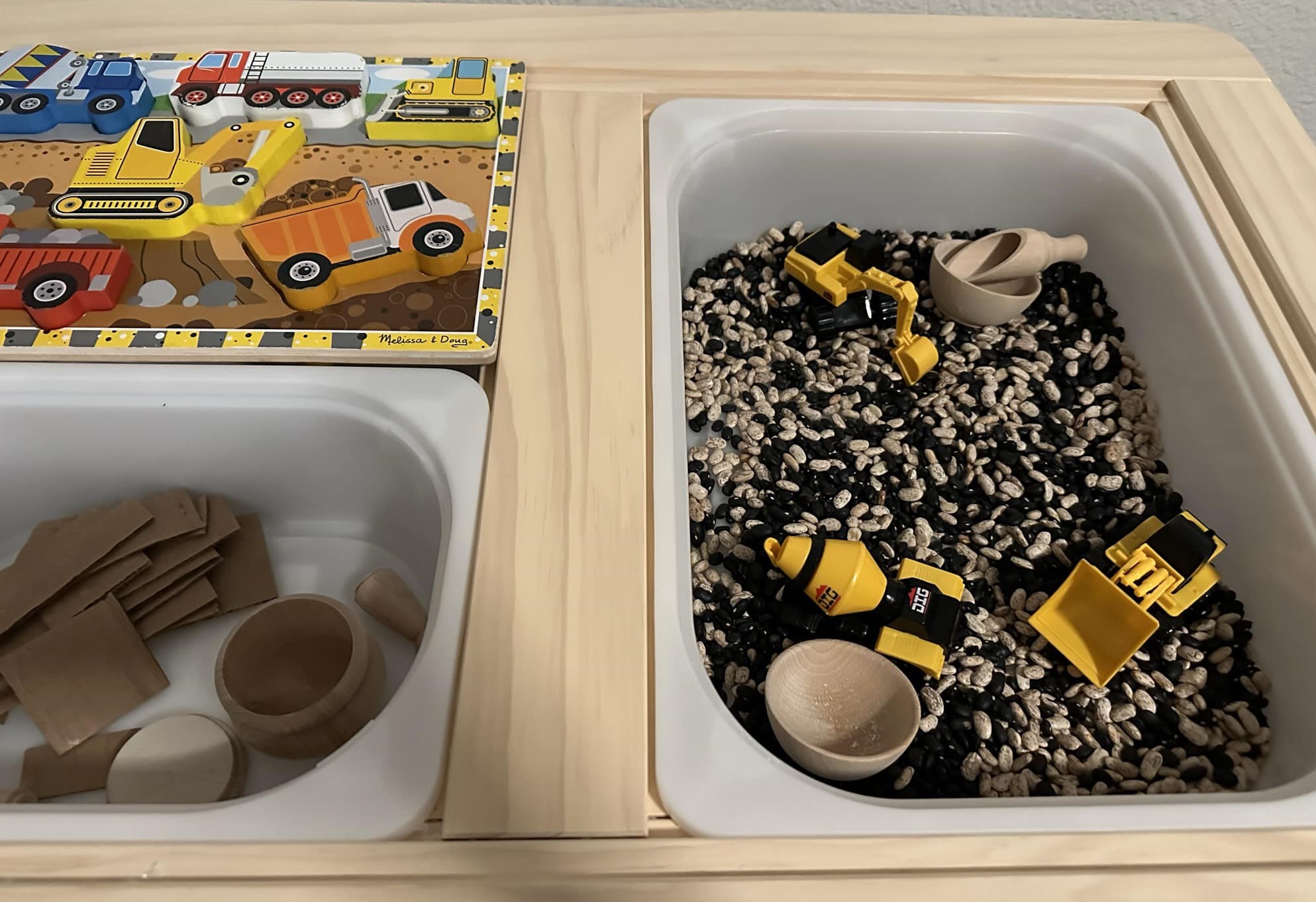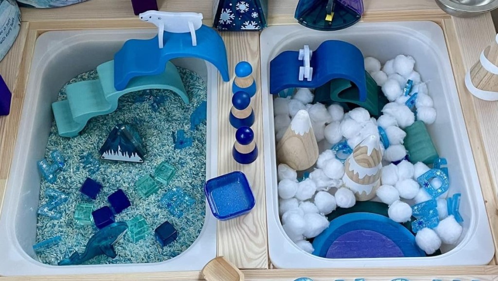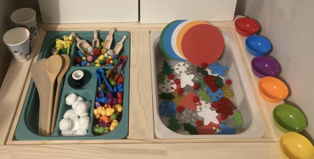 I recently joined a Facebook group called Flisat Table Simple Set-Ups. (The Flisat is a table from IKEA that can combine with Trofast storage bins or trays and some optional hacks to make a sensory bin. But it’s mostly sensory bin ideas that could work in any container.)