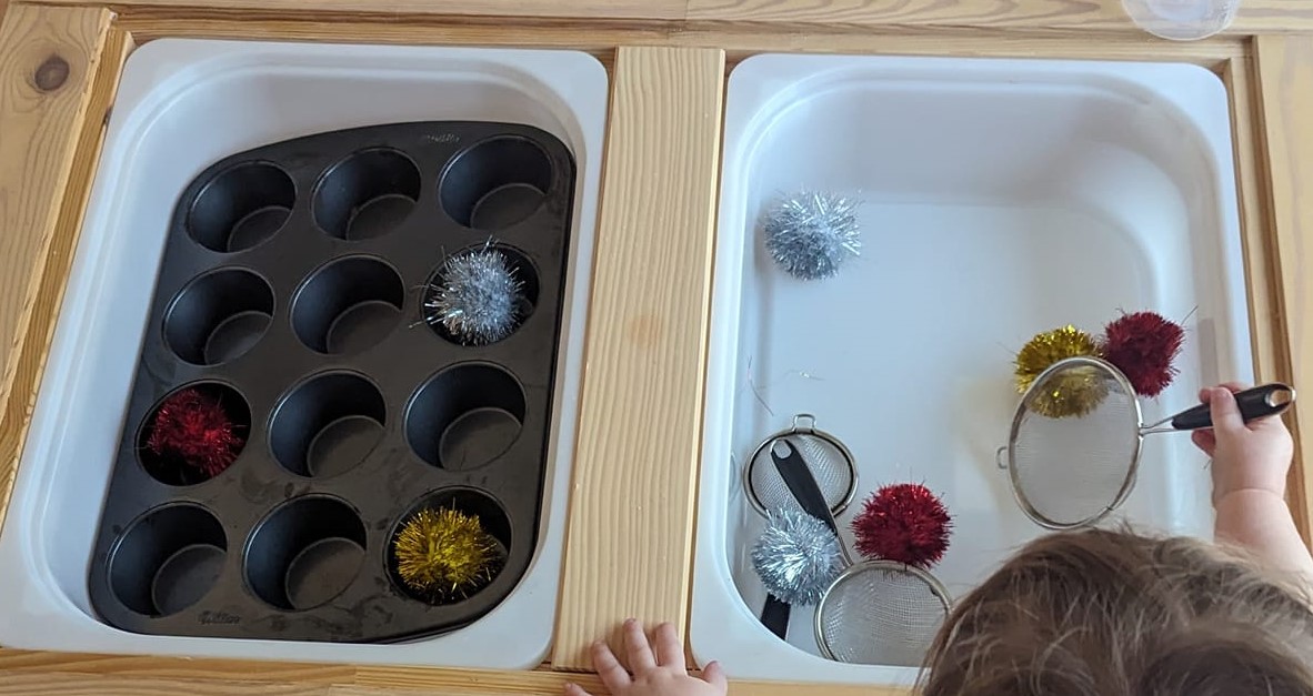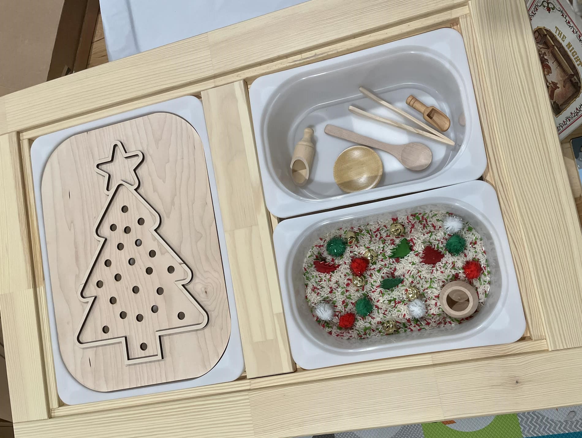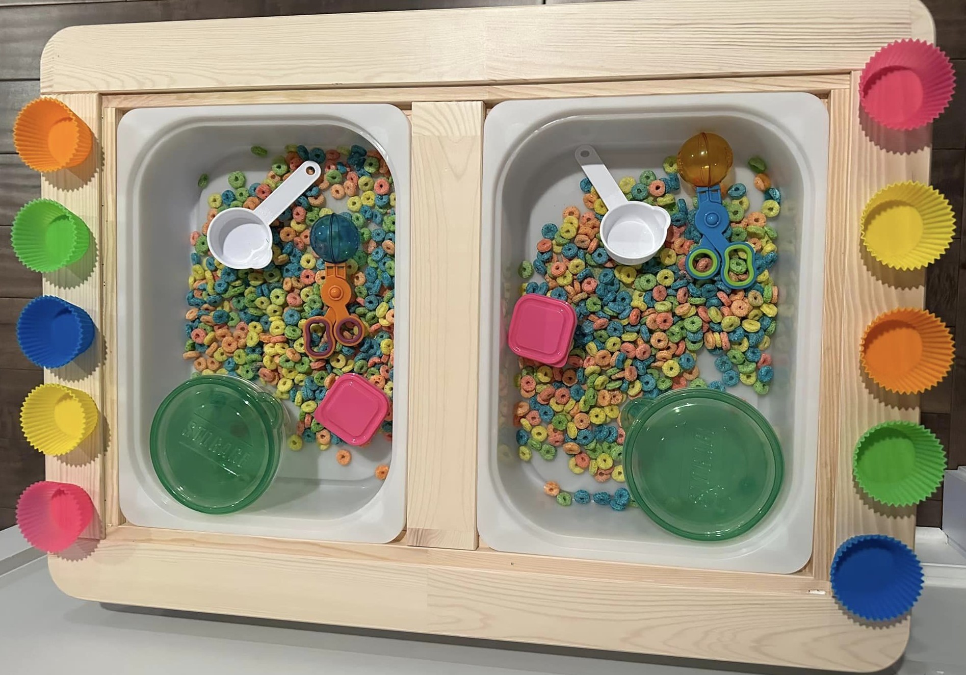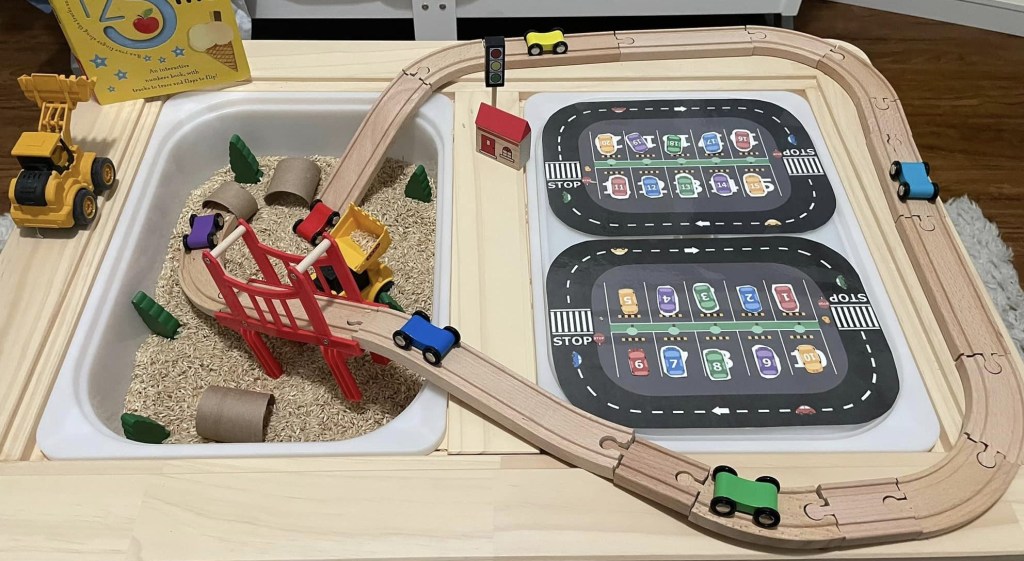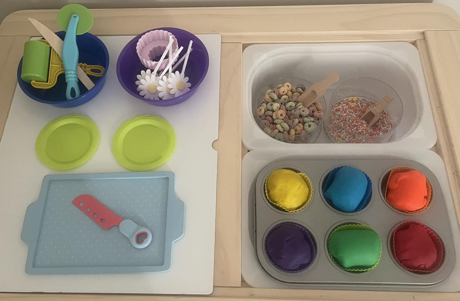 I recently joined a Facebook group called Flisat Table Simple Set-Ups. (The Flisat is a table from IKEA that can combine with Trofast storage bins or trays and some optional hacks to make a sensory bin. But it’s mostly sensory bin ideas that could work in any container.)