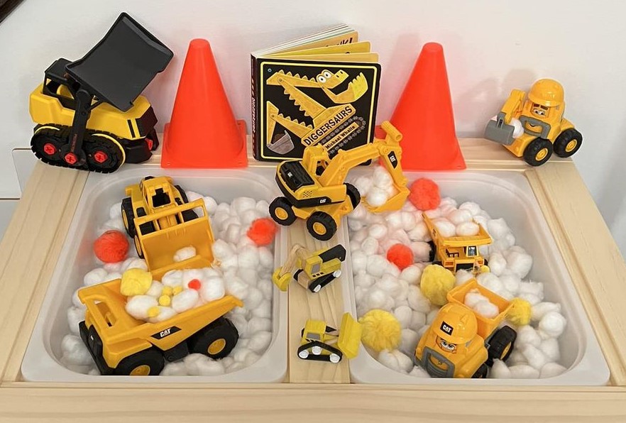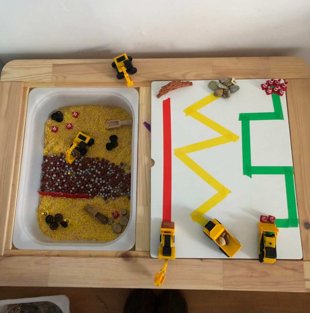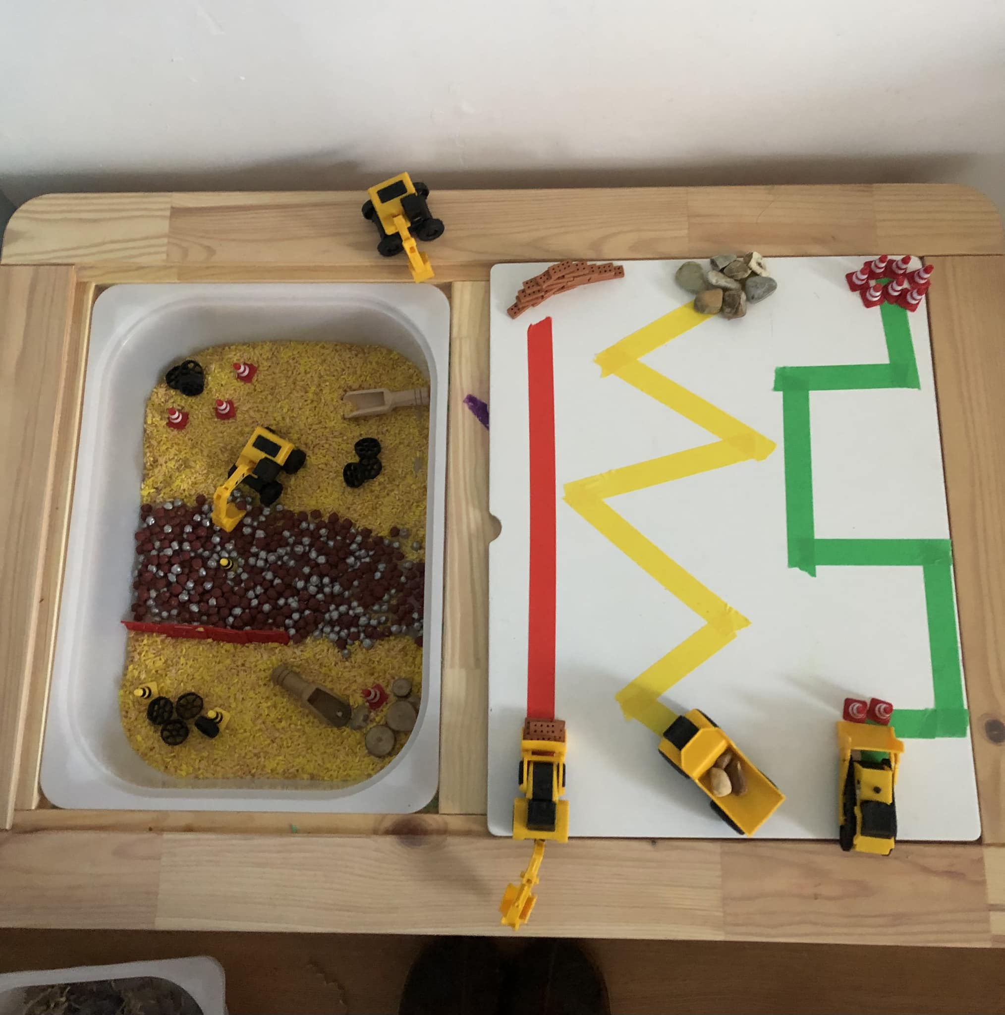 One of the first things to consider is how a child will interact with the bin. If you just have sensory material (e.g. rice) and nothing else, they sometimes stir it around with their hands for a minute and wander off. If you add a scoop, but no containers, they’ll want to transport the rice somewhere – that usually means dumping it on the floor. If you have a scoop and a container, they’ll usually scoop rice into the container till it’s full, dump it back in the bin and do it again. If you have larger items like rocks scattered in and a container, they’ll gather larger items and put them in the container, then pour rice over them. If you have rice, scoops, toy dump trucks, cardboard ramps and rocks, you’ve got a construction site! They’ll use scoops to fill the trucks with rice and rocks, drive them up and down the ramps, dump them, and go back for more.
