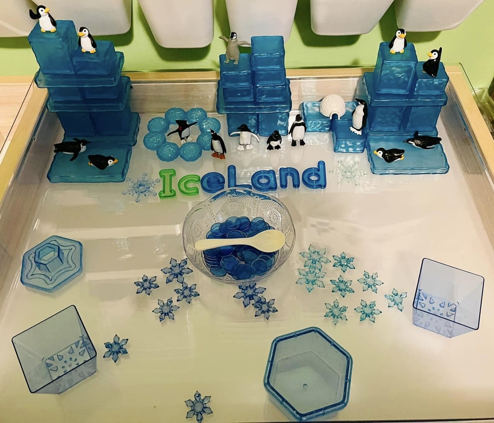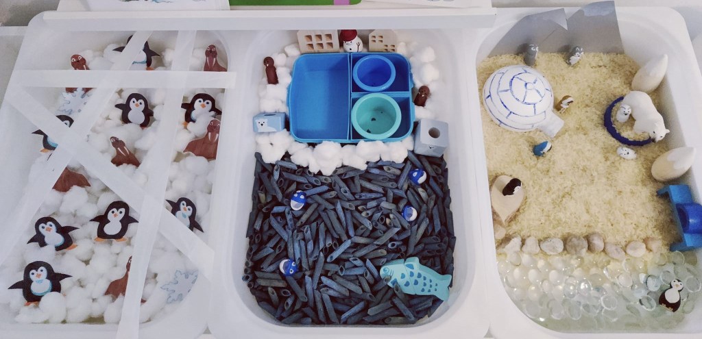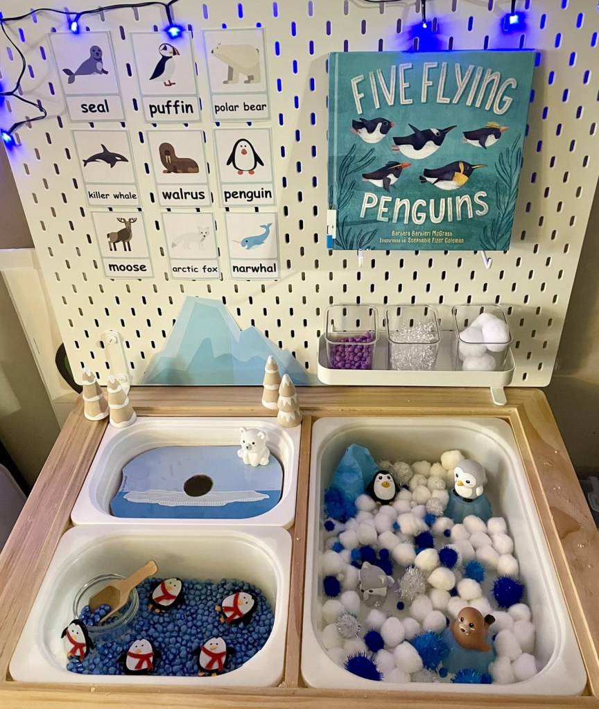 When people have a single bin, this is easier to remember, but I find that for folks who have the 3 bin Flisat setup it seems like it can be tempting to over-complicate things. Each of these examples below have great ideas! But, I would do them on separate occasions. The first has three great farm ideas – each could be their own bin on separate days. LOVE the arctic bins, especially the rescuing the penguins and polars from the tape maze, but again three separate days. And while the cocoa is a great idea, I personally feel like adding the letters overcomplicates it.