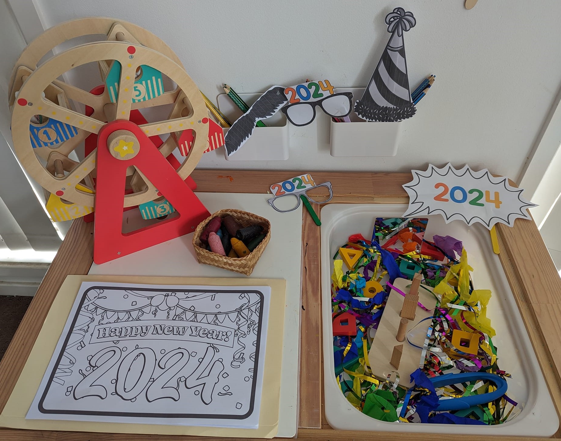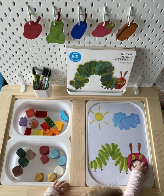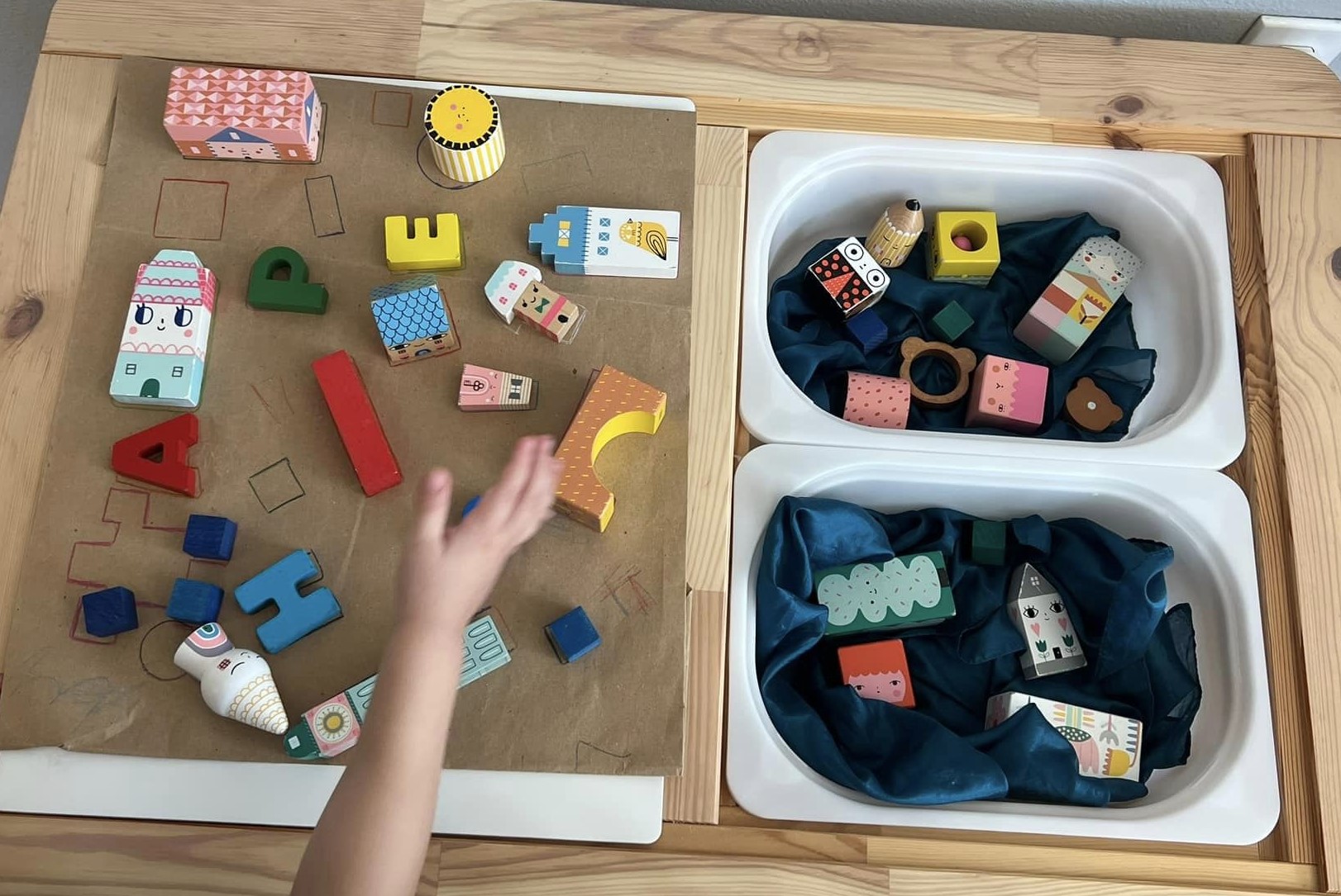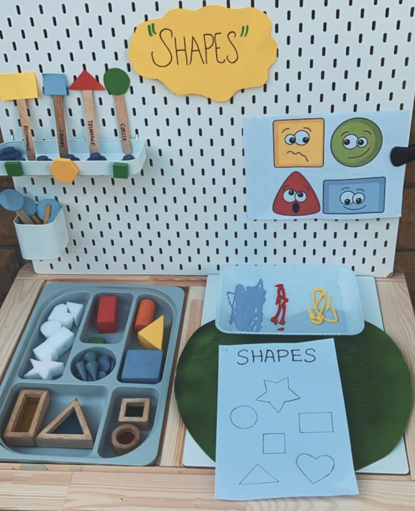 With older kids, it’s important to know when to stop. It is better to have one clear concept of play than to get overenthusiastic and keep adding ideas to the table. For example, though the ferris wheel is a lovely toy, I might put it and the coloring page elsewhere in the room and set the pegs for the shape sorter on the table, and this turns into a fun but simple hunt for shapes and sort them. The others have all got a lot going on. It would be better to step back, choose a couple of the ideas. Have a clear sense of how every item on/in the table could logically interact with every other item. Save the rest of your ideas and materials for another day.
