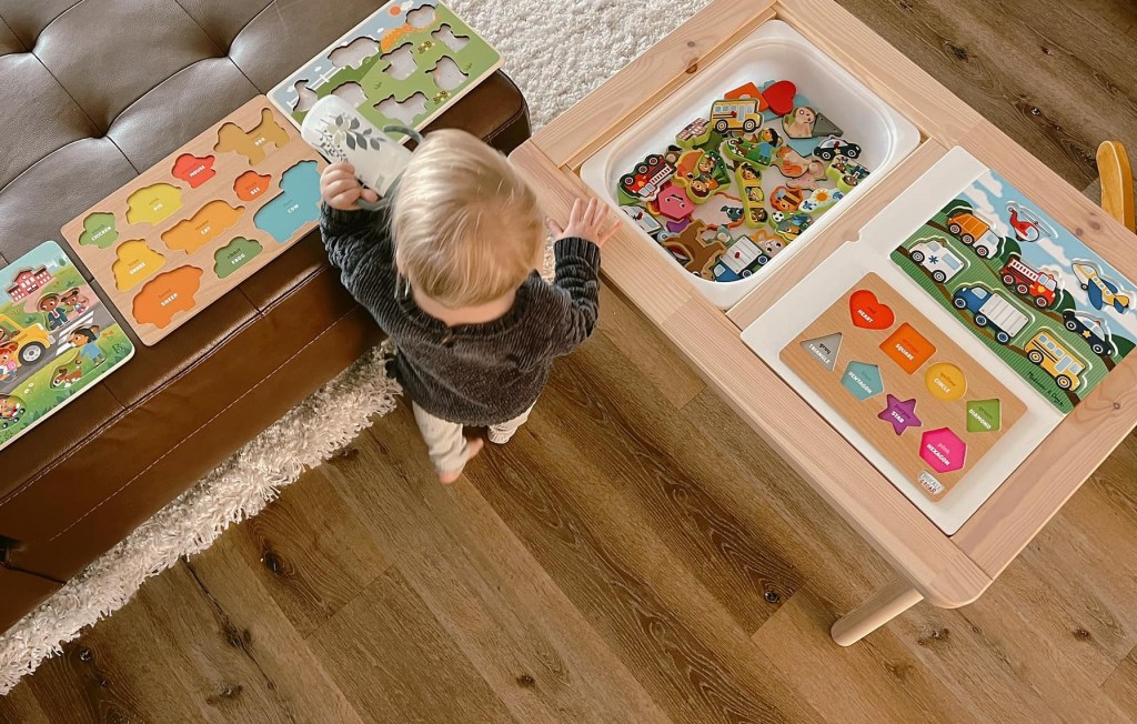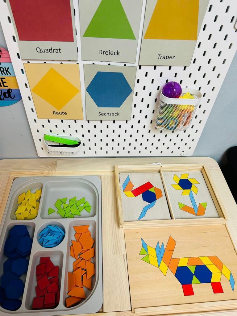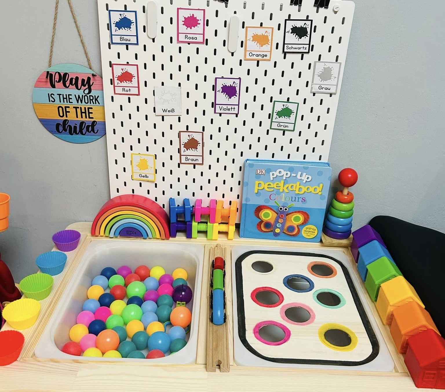 With older kids, it’s important to know when to stop. It is better to have one clear concept of play than to get overenthusiastic and keep adding ideas to the table. For example, though the ferris wheel is a lovely toy, I might put it and the coloring page elsewhere in the room and set the pegs for the shape sorter on the table, and this turns into a fun but simple hunt for shapes and sort them. The others have all got a lot going on. It would be better to step back, choose a couple of the ideas. Have a clear sense of how every item on/in the table could logically interact with every other item. Save the rest of your ideas and materials for another day.