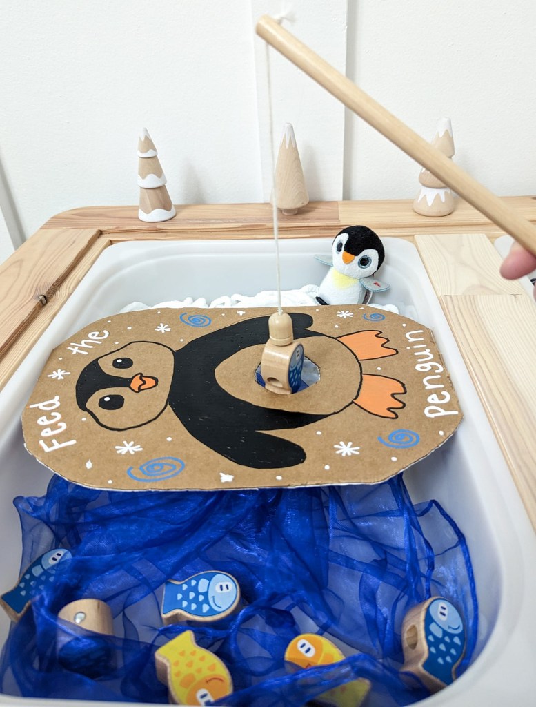 Here are three set-ups that are playing with similar ideas. You could cut a hole in cardboard “ice” and put magnet fishies underneath so kids could go ice fishing, then feed the penguin.