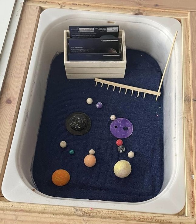Here are some examples of sensory bins which are lovely, but to me, it’s not clear what a child would do with it, rather than move things back and forth a bit and quickly move on. After you set up a bin, ask yourself: could I create an interesting call to action here that could extend the play time?