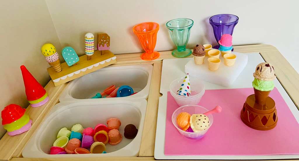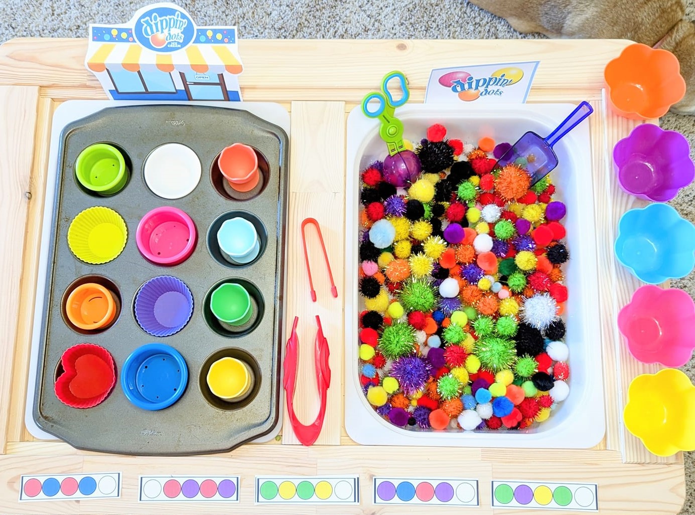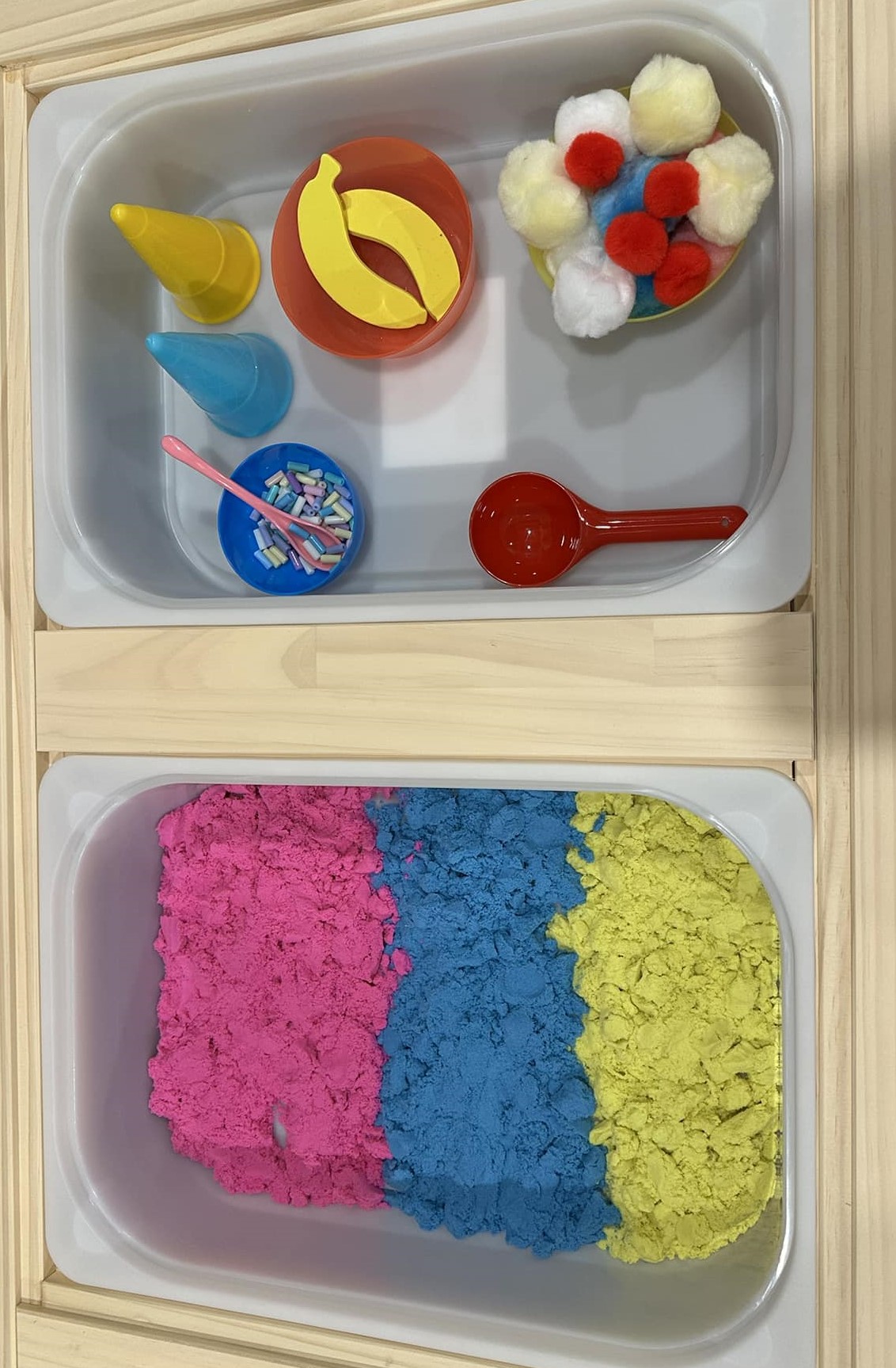 You can mix almost any toy or “manipulable” learning activity into the sensory bin. Sometimes this can give new life to a toy that your child may have become bored of. For example, when the toy horses and trains were mixed together, then rocks were added, the child then created stories of rock slides blocking the train tracks and horses coming to the rescue. When you’ve played too many times with all the fake food you have, could you move kitchen equipment to the sensory bin to explore new ideas? Building shape collages is a great learning activity, but could you mix them with sensory items to turn it into a hunt, then sort, then build? Putting toys with many parts (like this ice cream set) into the sensory bin is definitely fun, but could you add in even more fun with some whipped cream or the pompom dipping dot theme shown in the next picture? And how about putting dress-up accessories and a mirror at the sensory bin?