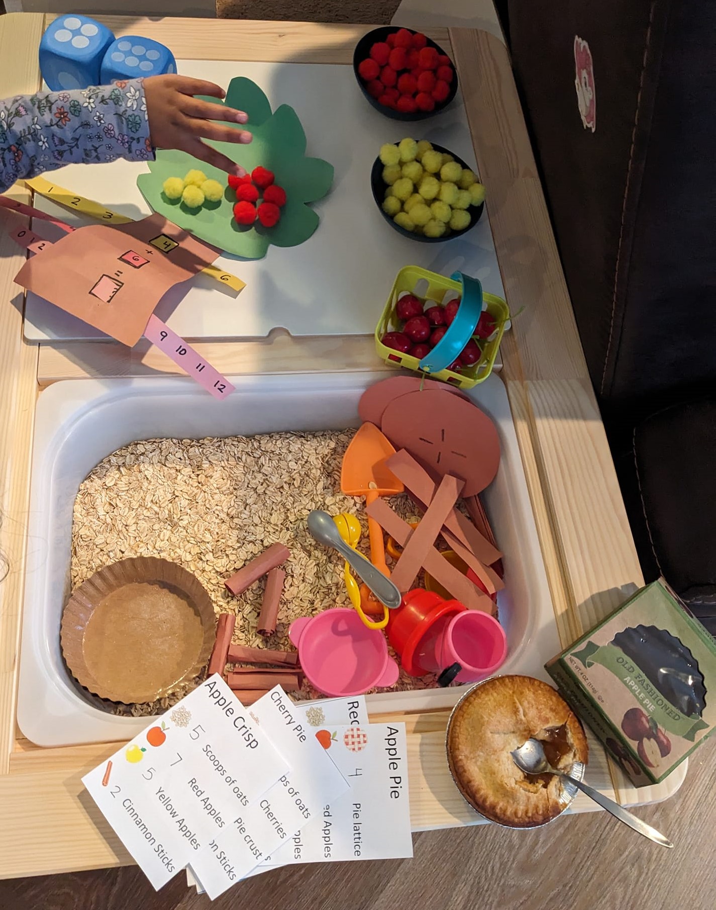 So, although any of the examples below might work for you (you know your own child / students best), I would not do them, because once these materials mix together, they could never be separated again. In my classroom, cheerios, sprinkles and 6 colors of playdough would be multi-colored blobs at the end of class; the sand and rainbow floam would be another multi-colored blob with scarves mushed in. While I LOVE the six different smell sensory ideas in the tray, I think doing them all close together would overload a child’s senses and make it hard for them to separate out the smells, AND they would all get intermixed and then be useless. And with both that one and the one below, having an actual mini pie mixed into the sensory bin would be a guaranteed gooey food-contaminated mess. Again, your mileage may vary, but that’s my experience.