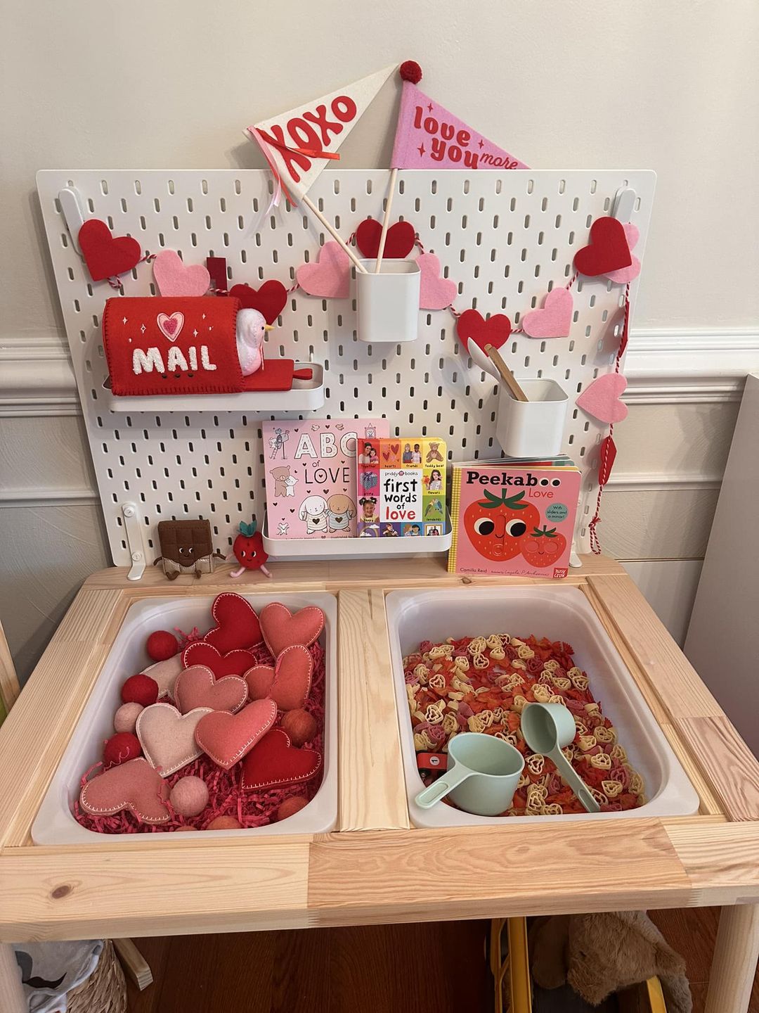 These mixes below would work for me. I could easily separate the pompoms and snowflakes from the beans, and it’s a fun mixture. Separating the balls, hearts, and pasta would be easy – the crinkled paper would be harder to separate out, but I think I could do it or maybe I’d store it with the pasta for the next time. The rice, cotton balls, ice cubes and letters would be easy to separate.