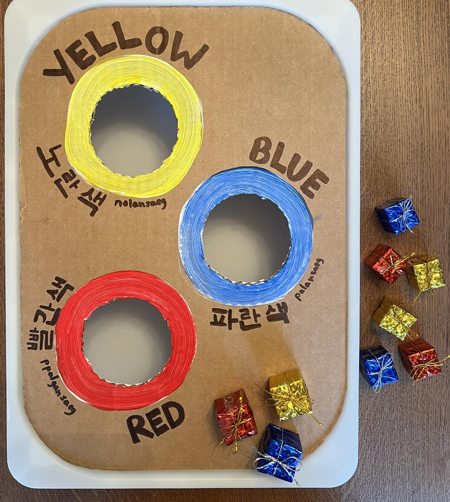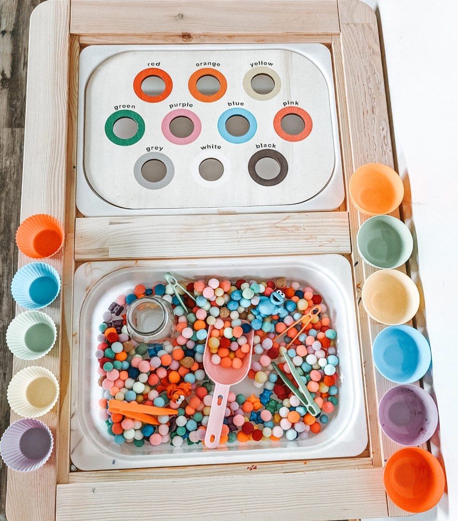 There’s also the idea of having a hole that they put things in or drop things into. Such as a pegboard, a series of holes (these also hold funnels), a hockey rink (use straws to blow pompoms into the goal), or colored holes for color sorting.
