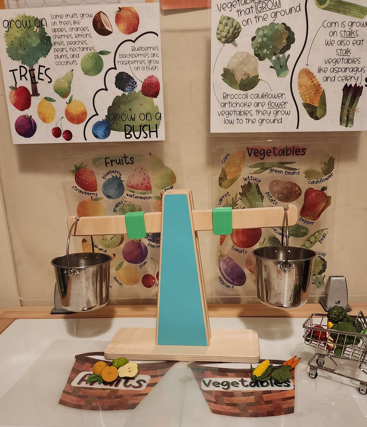 Here, you see sorting by shapes (you don’t need this special Etsy insert – just put one of your shape sorters in the bin, and then add rice or another sensory material just for fun), sorting by type of bean, or sorting fruits from vegetables and weighing them.