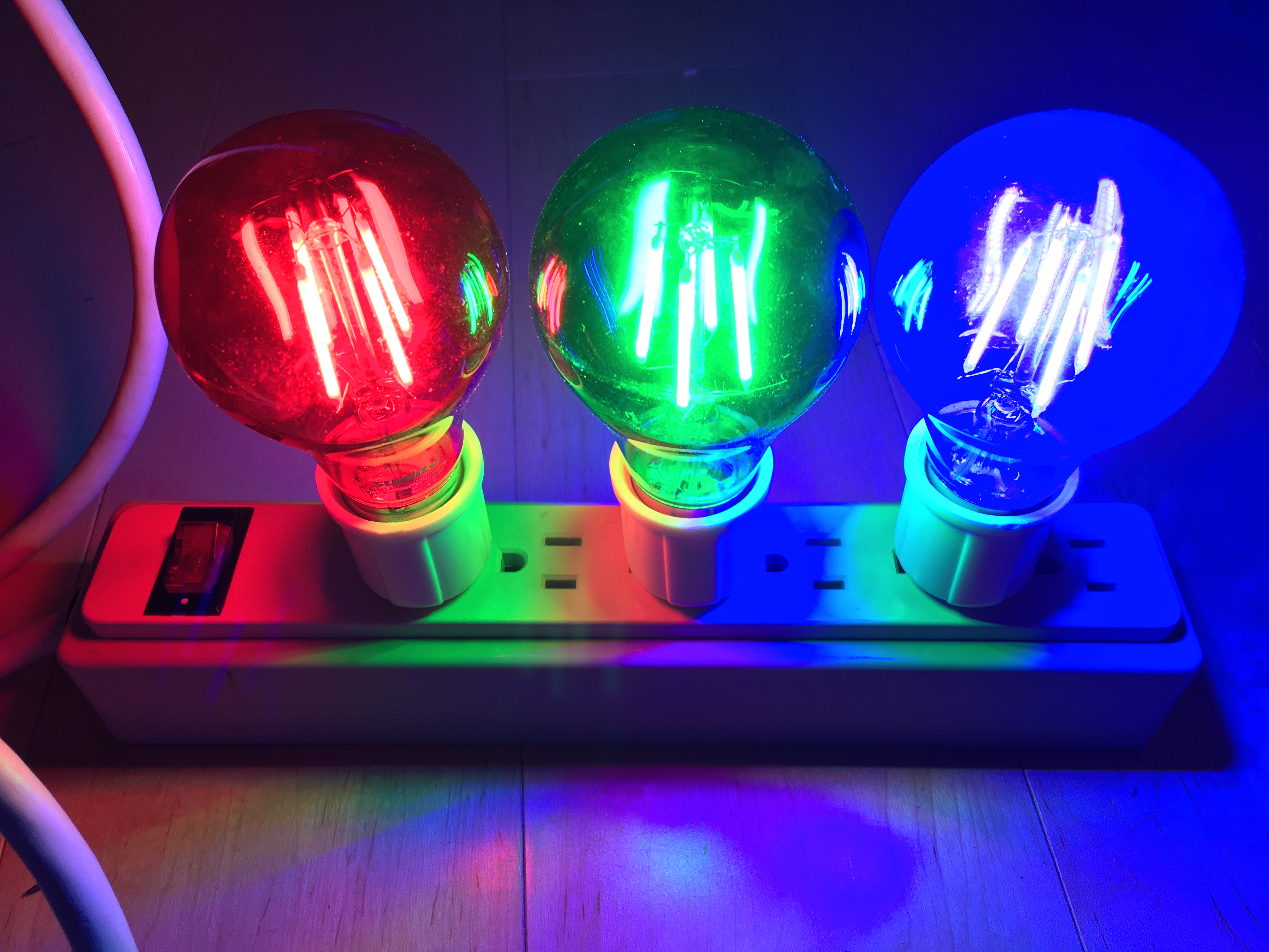 Color Mixing Lightbulbs. I built this lightbox which uses colored LED bulbs and dimmer switches to mix light. Learn more here.
